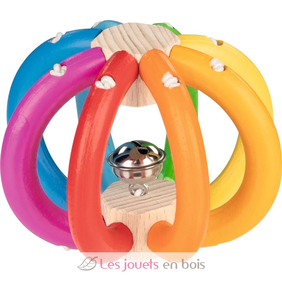 Greifling Elastik Regenbogenball, eine in Deutschland hergestellte Holzrassel von Goki. Referenz 65327.