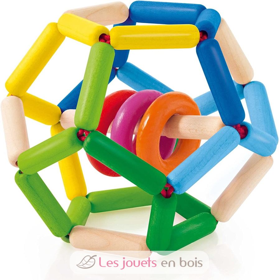 Hier darf nach Herzenslust geknautscht, gedrückt und gerollt werden! Auf faszinierende Weise findet der kunterbunt leichte Ball immer wieder in seine ursprüngliche Form zurück. Durch die großen Öffnungen lässt er sich an den vielen abgerundeten Perlenstäbchen ideal greifen. Drei farbenfrohe Rasselringe belohnen die eifrigen Bewegungen des Babies mit anregendem Geklapper. Fördert die sensorischen Fähigkeiten. S