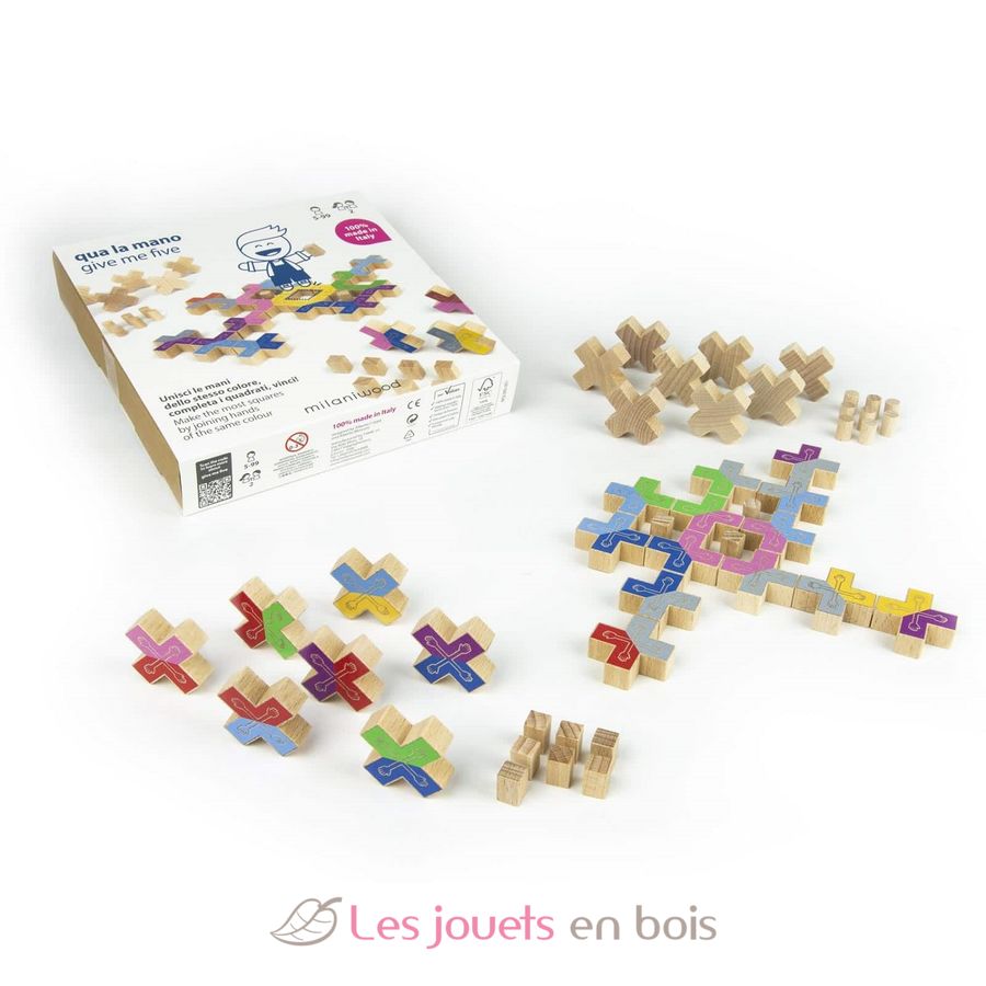 Gib mir fünf ist eine innovative Art von Dominosteinen, die mit Farben gespielt werden, die Logik und die Fähigkeit entwickeln, Übereinstimmungen zu sehen. Jedes der 28 Teile hat 2 Hände in einer Farbe und 2 Hände in einer anderen Farbe; jedes Stück ist ein Unikat. Beide Spieler mischen die Steine, die verdeckt auf der Spielfläche liegen, und dann nimmt jeder Spieler 14 Steine und 9 Marker der gleichen Art. Der erste Spieler spielt eine Figur. Der nächste Spieler versucht dann, ein weiteres Stück an dieses erste Stück anzuhängen, indem er eine Übereinstimmung schafft, aber die Hände müssen dieselbe Farbe haben – z. eine gelbe Hand berührt eine gelbe Hand, hellblau zu hellblau, lila zu lila … aber niemals grün zu rot. Abwechselnd kombinieren die Spieler so viele Teile wie möglich. Sieger ist der Spieler, der die meisten gleichfarbigen und gemischtfarbigen Quadrate bildet.