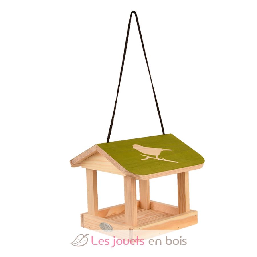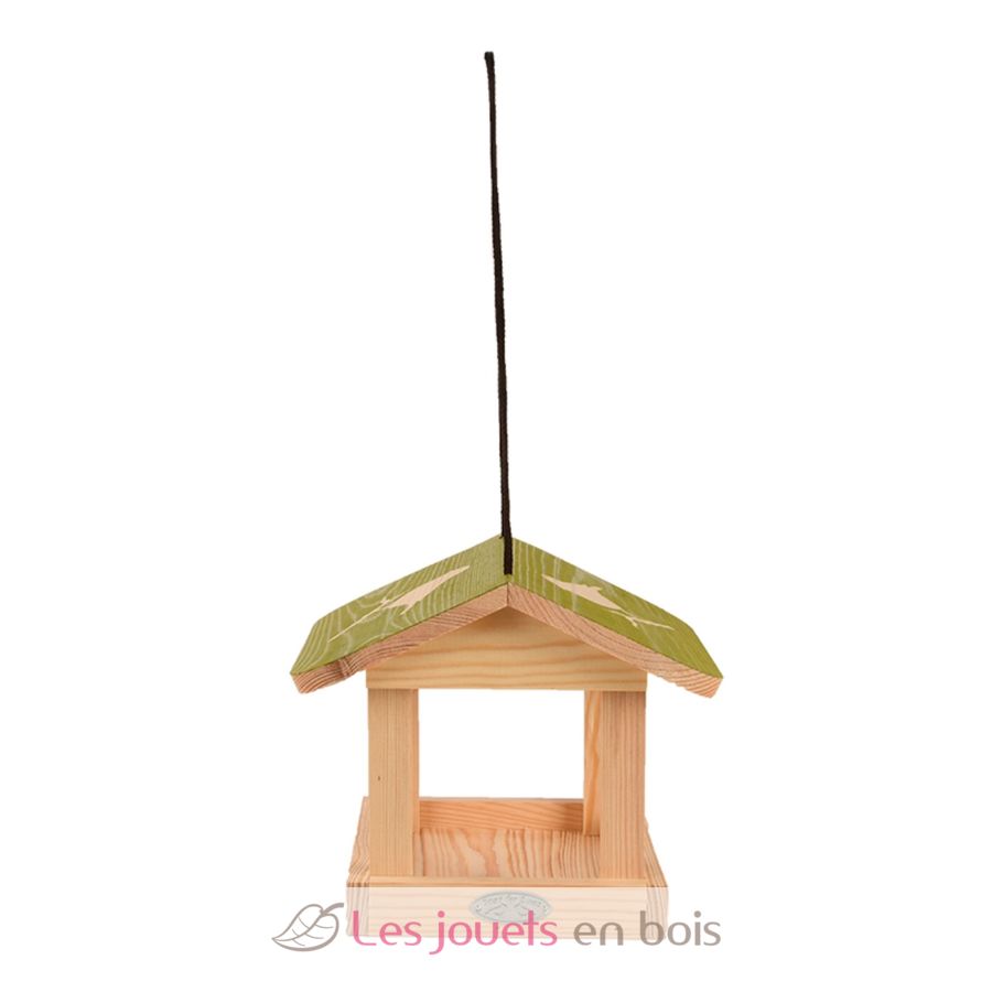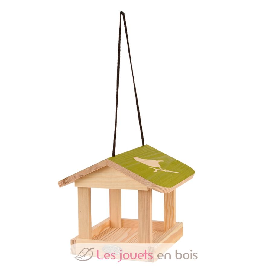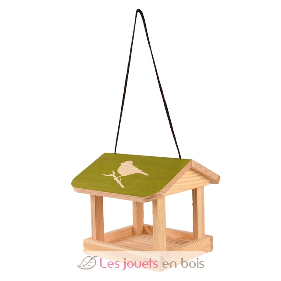 Bei diesem Vogelhäuschen handelt es sich um ein hübsches hängende Futterhaus aus Kiefernholz mit einem bunten Dach mit Vogelsilhouetten.