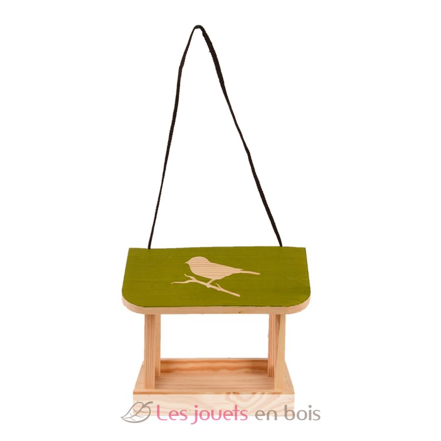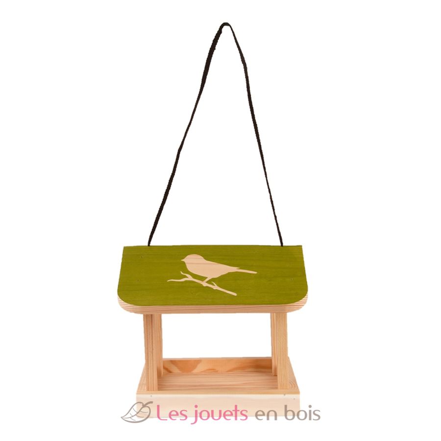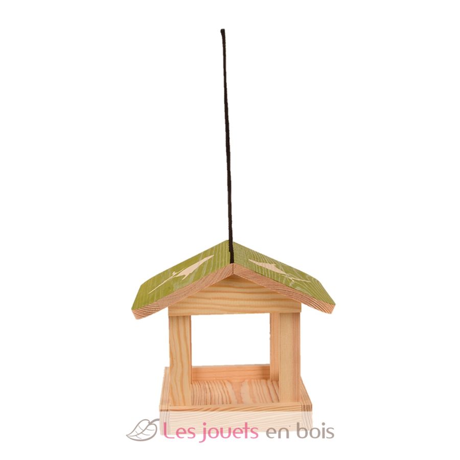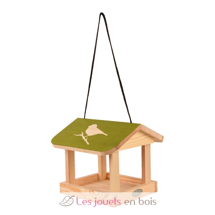 Bei diesem Vogelhäuschen handelt es sich um ein hübsches hängende Futterhaus aus Kiefernholz mit einem bunten Dach mit Vogelsilhouetten.