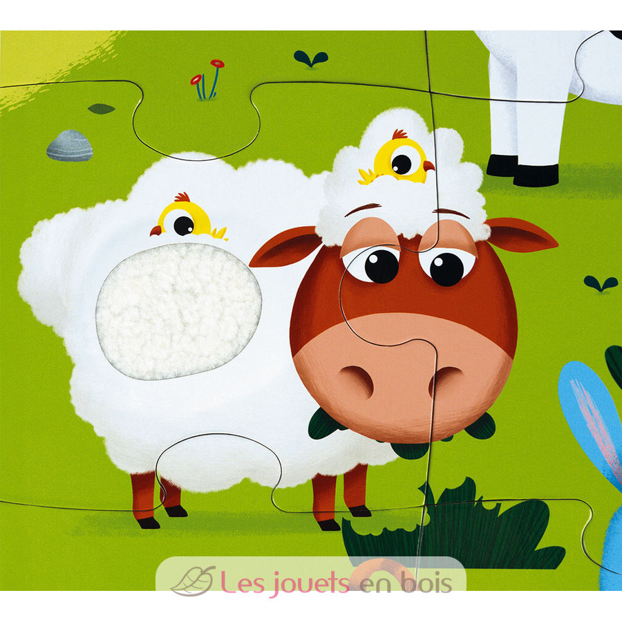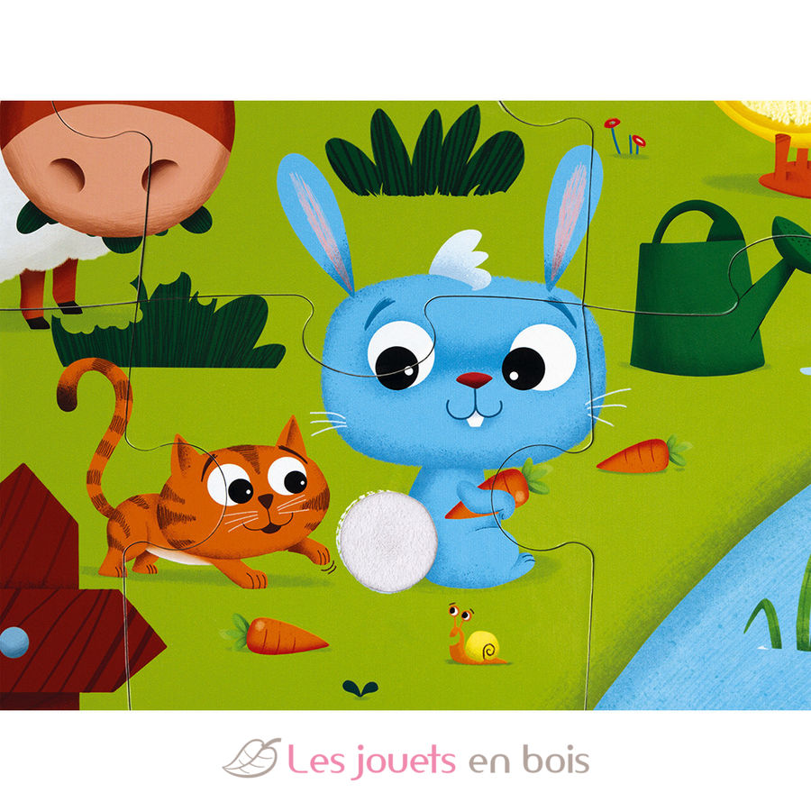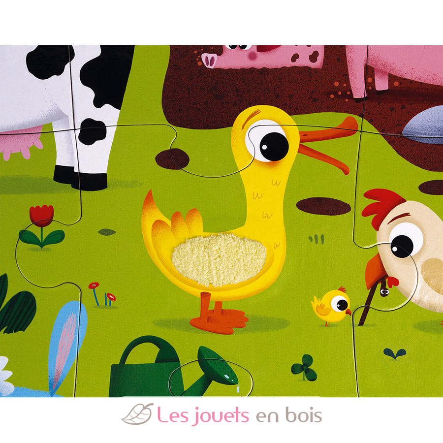 Lasst uns mit diesem 20-teiligen Puzzle für Kinder ab 2 Jahre die Bauernhoftiere kennenlernen! Sein Plus? Es ist ein Haptik-Puzzle! Es wird großen Spaß machen, das weiche Fell des Kuhfell, Schafsfell, Hasenschwanz, Schwein, Ente, Hahnenkamm zu erforschen, sobald das Puzzle fertig ist! Durch Streicheln und Erforschen dieser lustigen Materialien können die Kinder ihren Tastsinn entwickeln! Die wunderschönen, leuchtend bunten Bilder dieses riesigen Puzzles zeigen eine exotische Welt mit lustigen Details.
