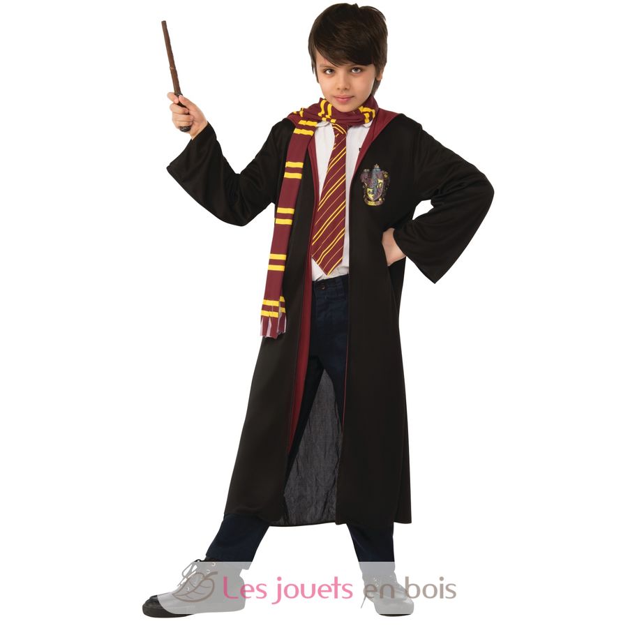 Dieses Kinderkostüm besteht aus einer schwarzen Zaubererrobe aus Jersey mit angenähter Kapuze und dem Gryffindor-Wappen auf der Brust, einer rot-gelb gestreiften Krawatte mit Gummiband, einem Stoffschal in den Gryffindor-Farben und einem Harry Potter-Zauberstab aus PVC.