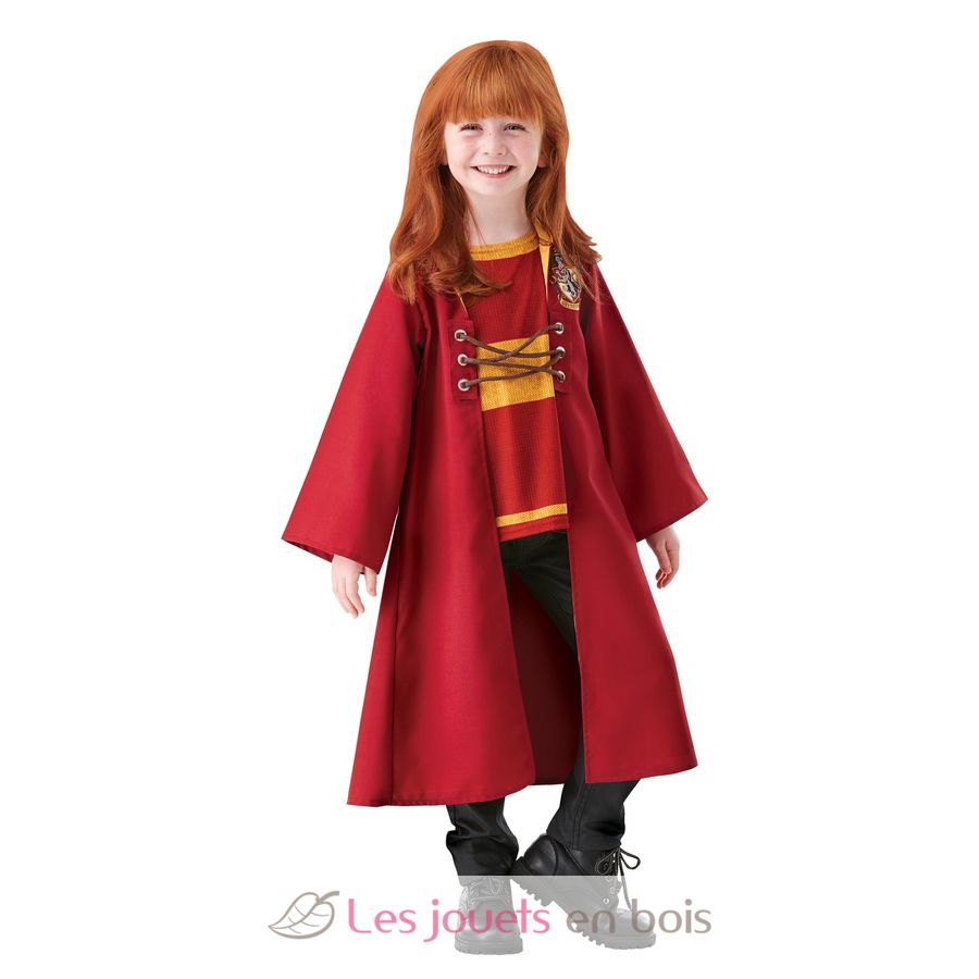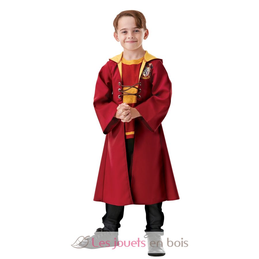 Dieses Kinderkostüm besteht aus einem rot-gelben Quidditch-Umhang aus Stoff mit integrierter Kapuze, dem auf der Brust aufgedruckten Gryffindor-Wappen, Schnürverschlüssen an der Vorderseite und einem in den Umhang integrierten bedruckten Jersey-Oberteil.