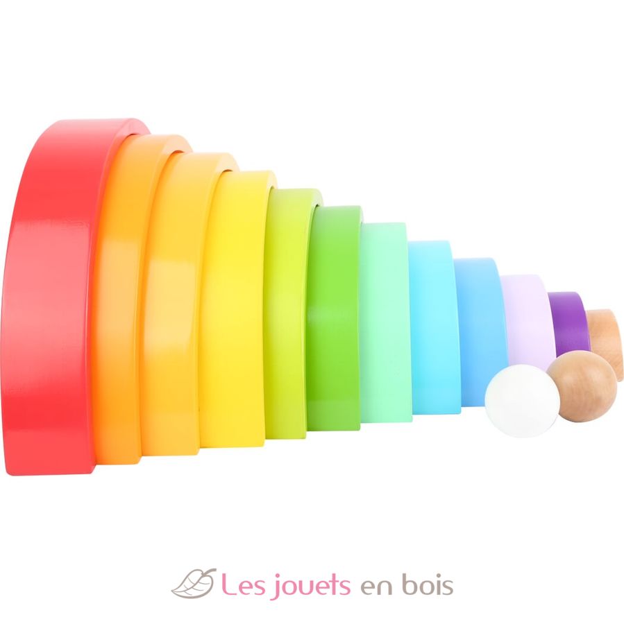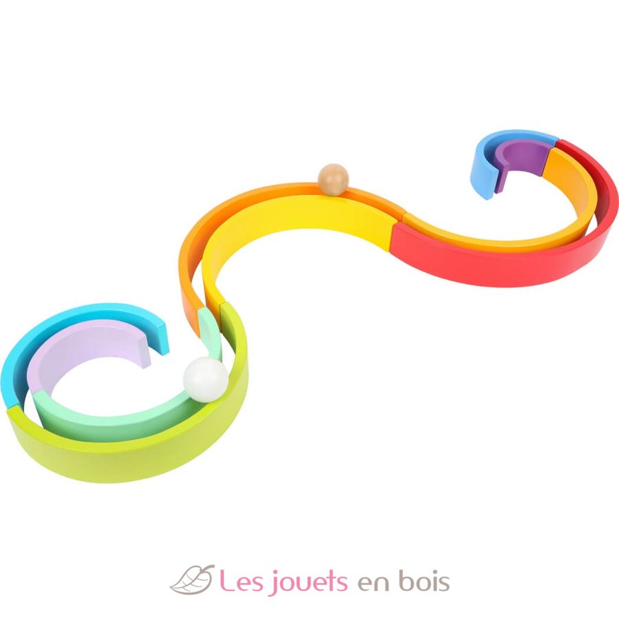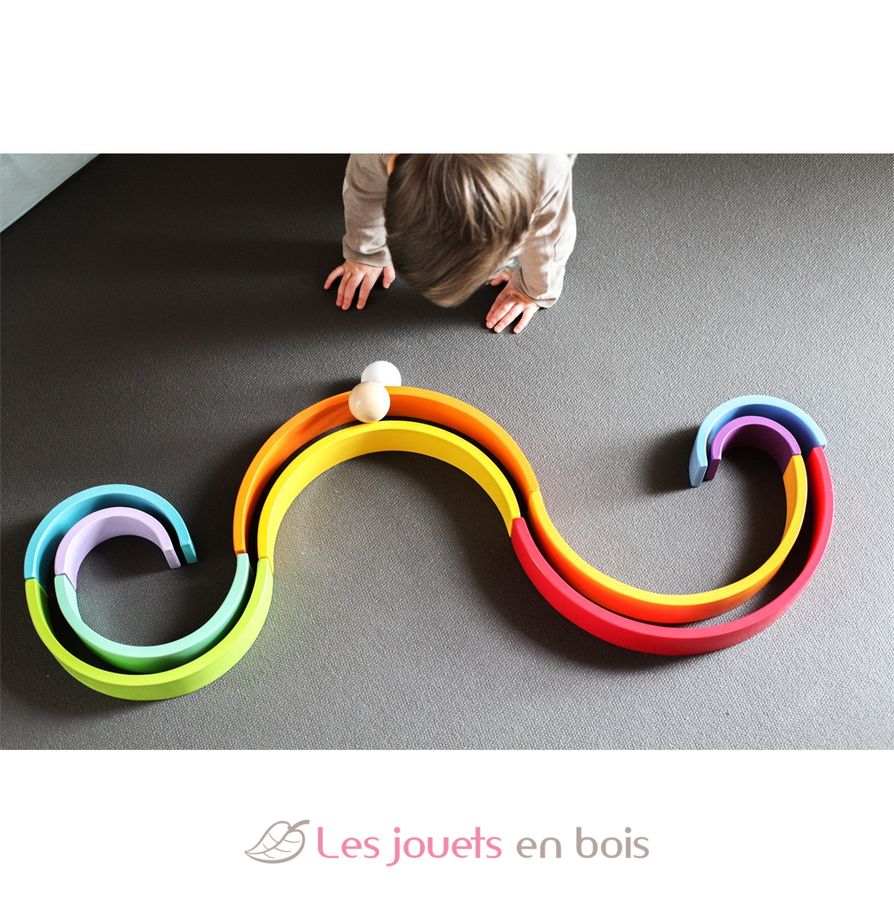 Der Regenbogen inklusive 2 Holzkugeln besteht aus stabilem Holz und ist in kräftigen Farben lackiert. Dieses Spielzeug kann für eine Vielzahl kreativer Spiele zum Bauen von Türmen, Brücken, Häusern und Hindernissen verwendet werden. Die Blöcke können gestapelt, sortiert oder sogar in einer Reihe angeordnet werden, um einen Weg für die beiden Kugeln zu schaffen.