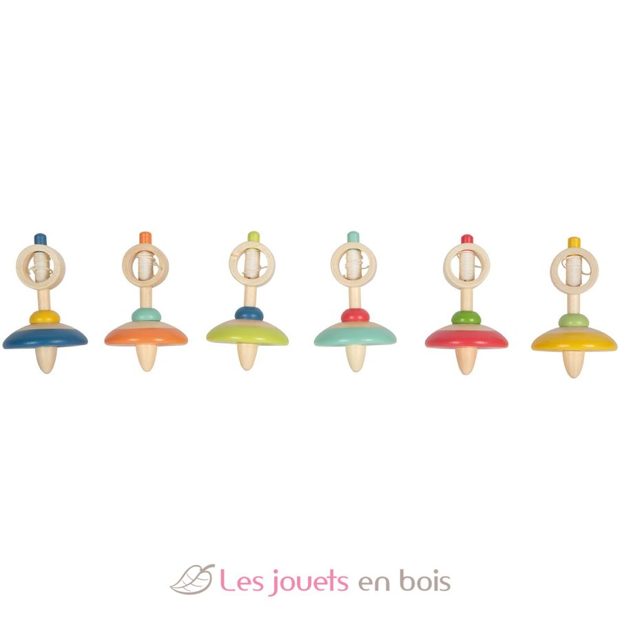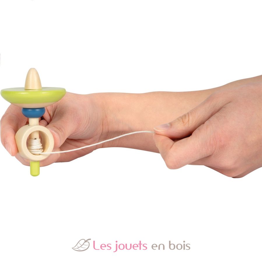 Dieser farbenfrohe Holzkreisel mit Aufziehfunktion besticht durch seine Dynamik!