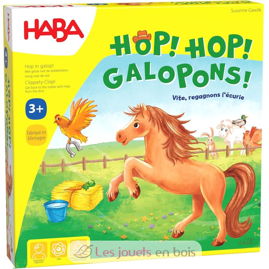 Galoppierende bis 7 nützliches Zubehör, um sein Pferd zu erholen und bringen ihn zurück zu seiner ersten Box. Dieses Spiel fördert die Beobachtung und Entscheidungsfindung, zu verstehen, erste Regel-Spiel 2 bis 4 Spieler. 3-8 Jahre.