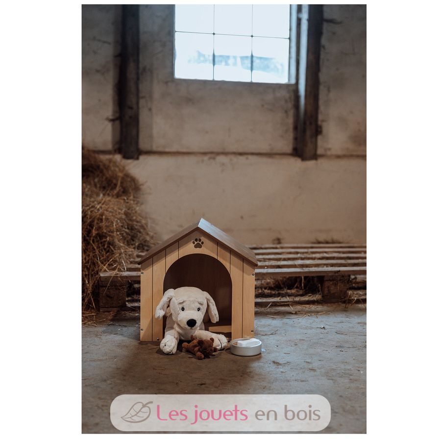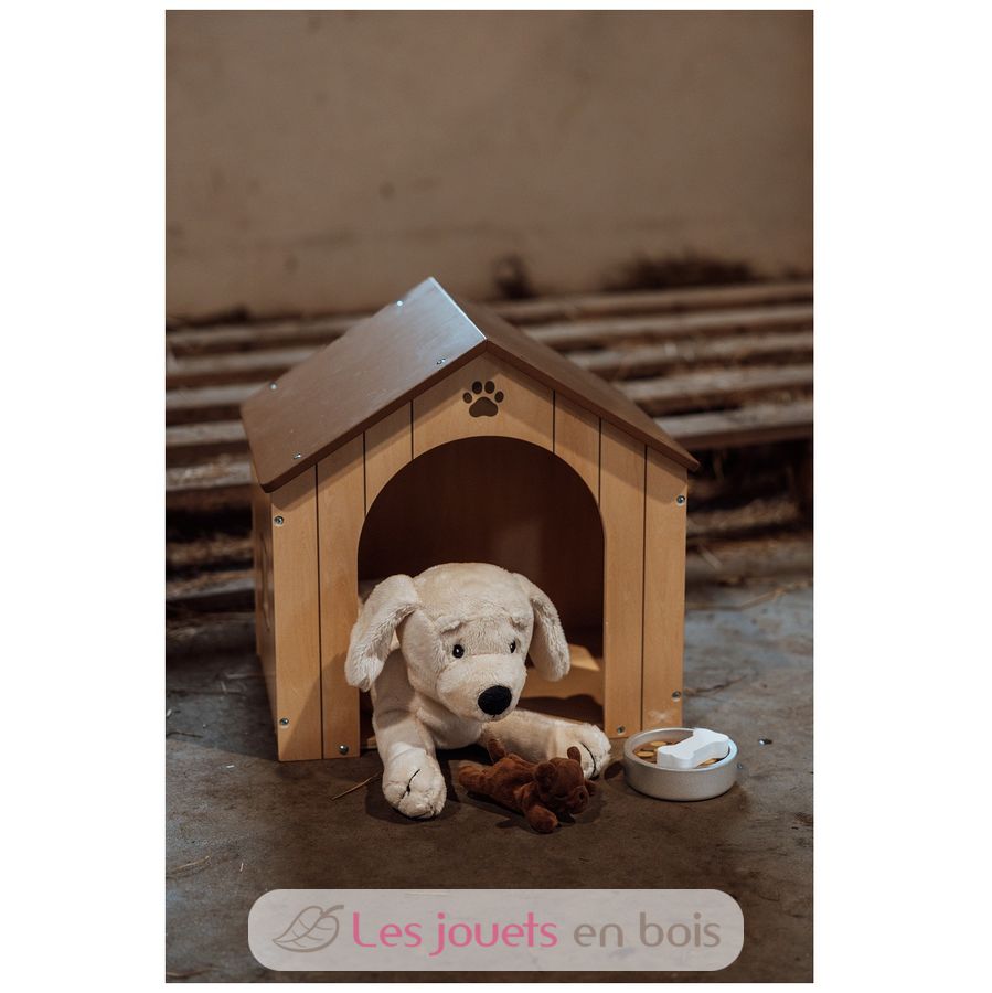 Entdecken Sie dieses hübsche Holzhundehaus und sein Zubehör und lassen Sie Ihr Kind mit Freude seinen Stoffhund pflegen.