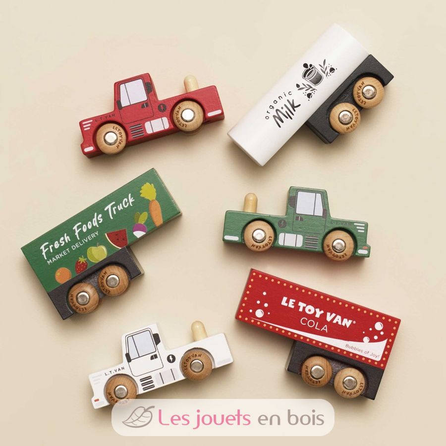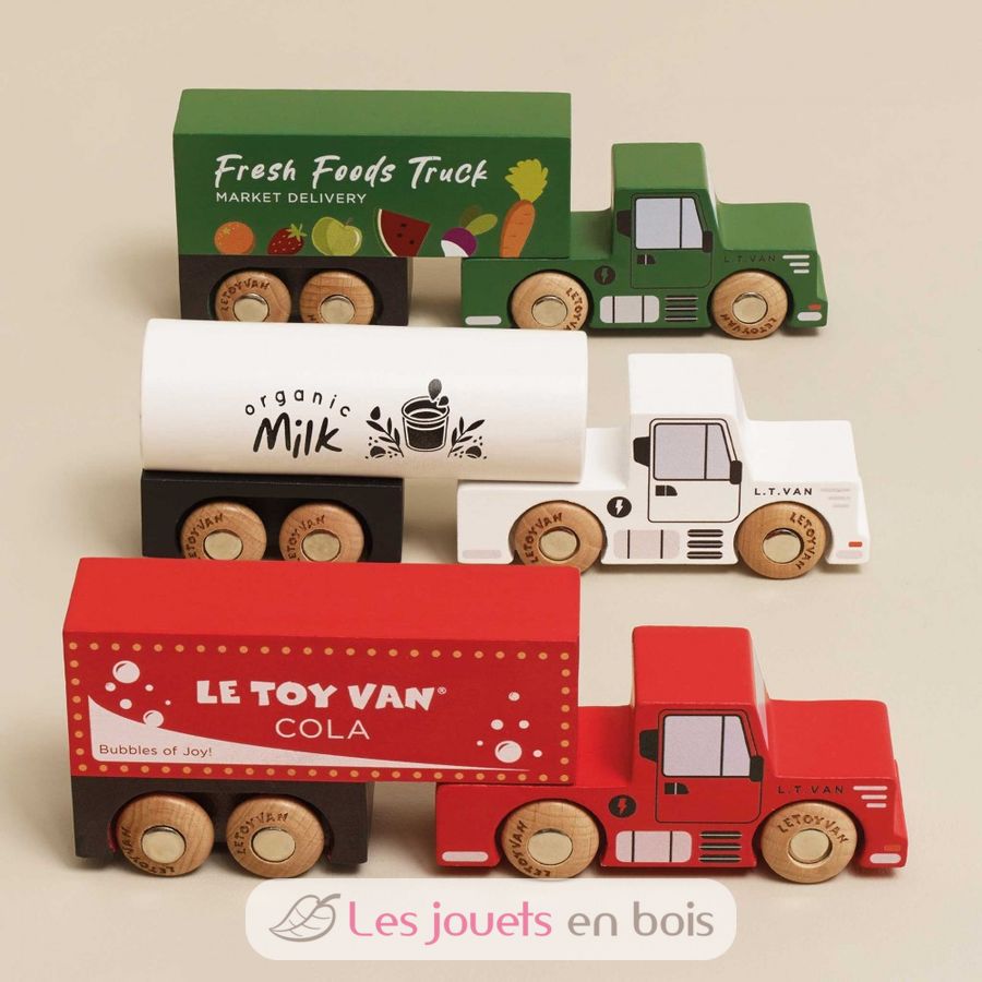 Dieses Set enthält 3 Lastwagen mit Anhängern: Cola, frisches Obst und Gemüse sowie Bio-Milch. Jeder Lastwagen verfügt über einen abnehmbaren Anhänger. Die Holzräder sind mit herkömmlichen Holzeisenbahnschienen kompatibel. Das Set lässt sich leicht mit anderen Spielzeugen oder Fahrzeugen kombinieren, um neue Geschichten zu erfinden.