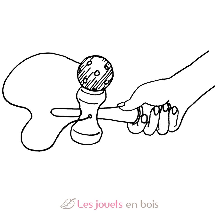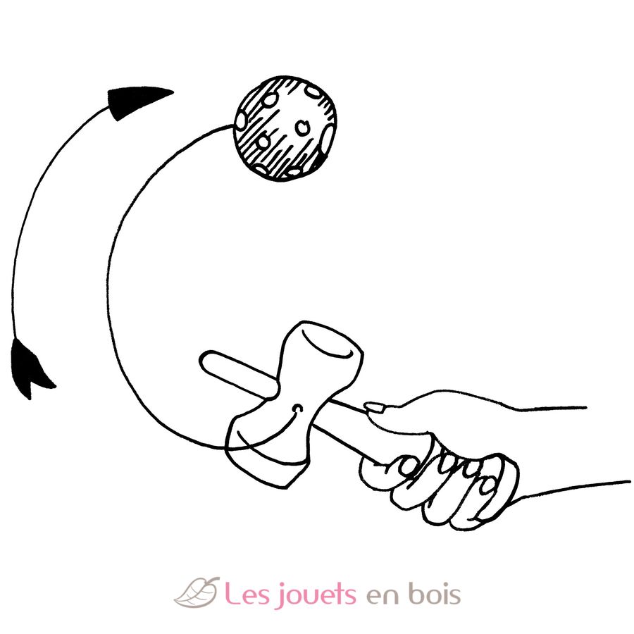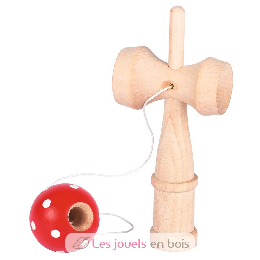Die Holzkugel hängt an einem Band an einem Griff aus Vollholz mit zwei Mulden und einem kleinen Stiel. Hand ergreift Griff und wirbelt die Kugel hoch, Kugel landet in einer der Mulden oder wird aufgespießt oder, was wahrscheinlicher ist, baumelt weiterhin gelangweilt neben dem Griff. Dieses Spiel schult die Motorik und vertieft die Erkenntnis, dass nichts im Leben so leicht ist, wie es aussieht.