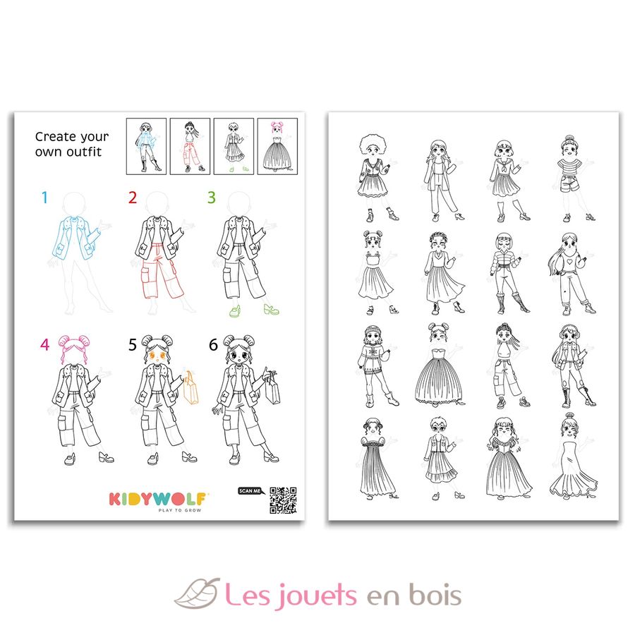 Mit Kidydraw Pro Fashion werden Kinder zu angehenden Modedesignern. Dank eines ausgeklügelten Aufklebersystems können sie Silhouetten, Outfits, Accessoires und Muster auf unzählige Arten kombinieren – mit über 1.000 möglichen Kombinationen, genau wie in einem echten Modestudio.