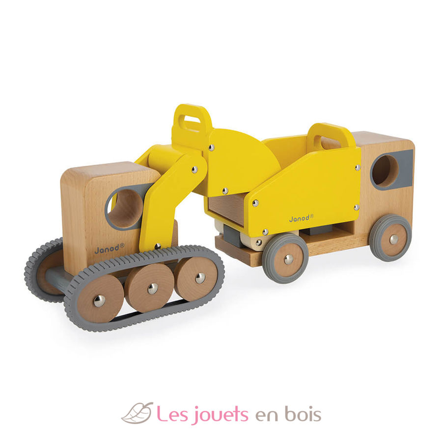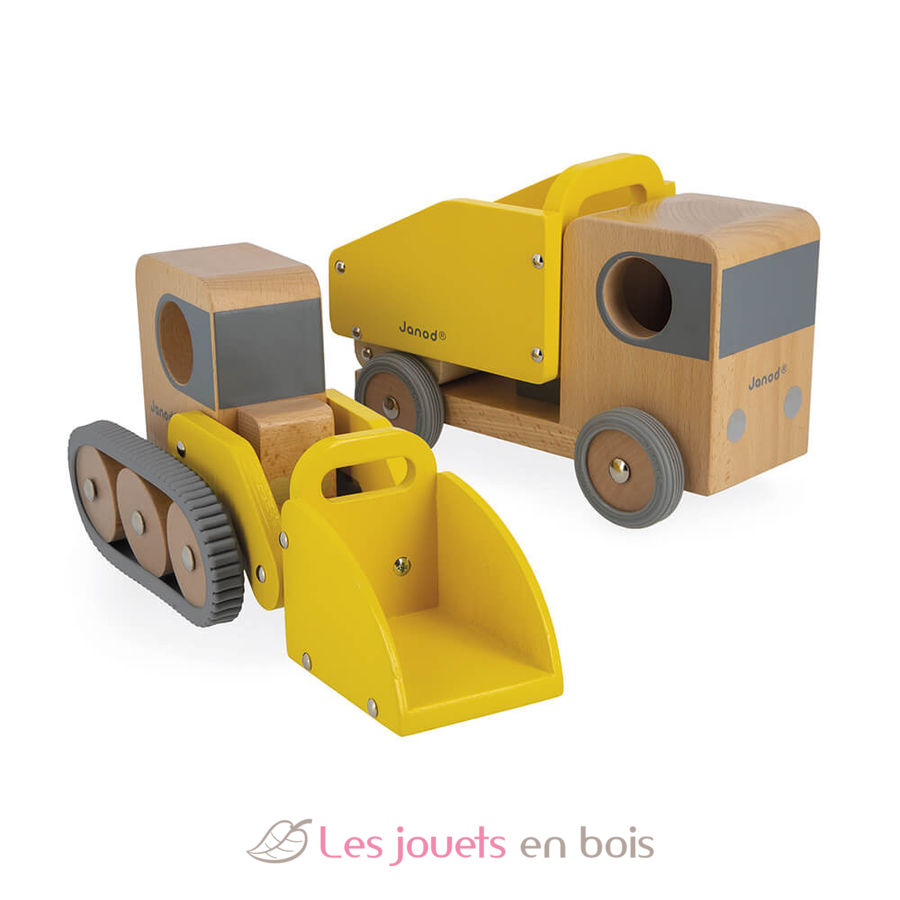 Kipplaster und Bagger Bolid, Baufahrzeuge aus Holz der Marke Janod. Referenz J04634.