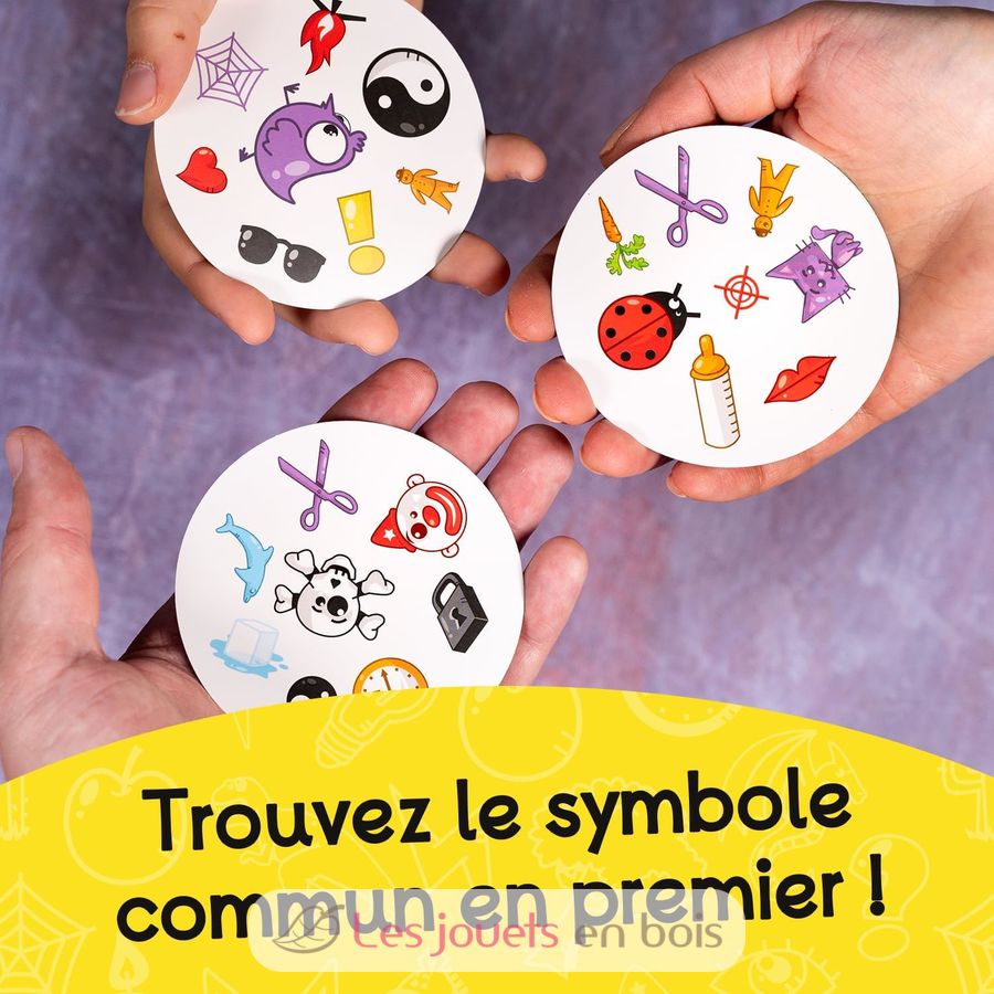 Bei Dobble gibt es zwischen den Karten immer nur ein passendes Symbol. Finde es schneller als deine Mitspieler und nenne es als Erster, um zu gewinnen!