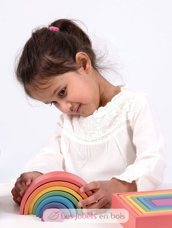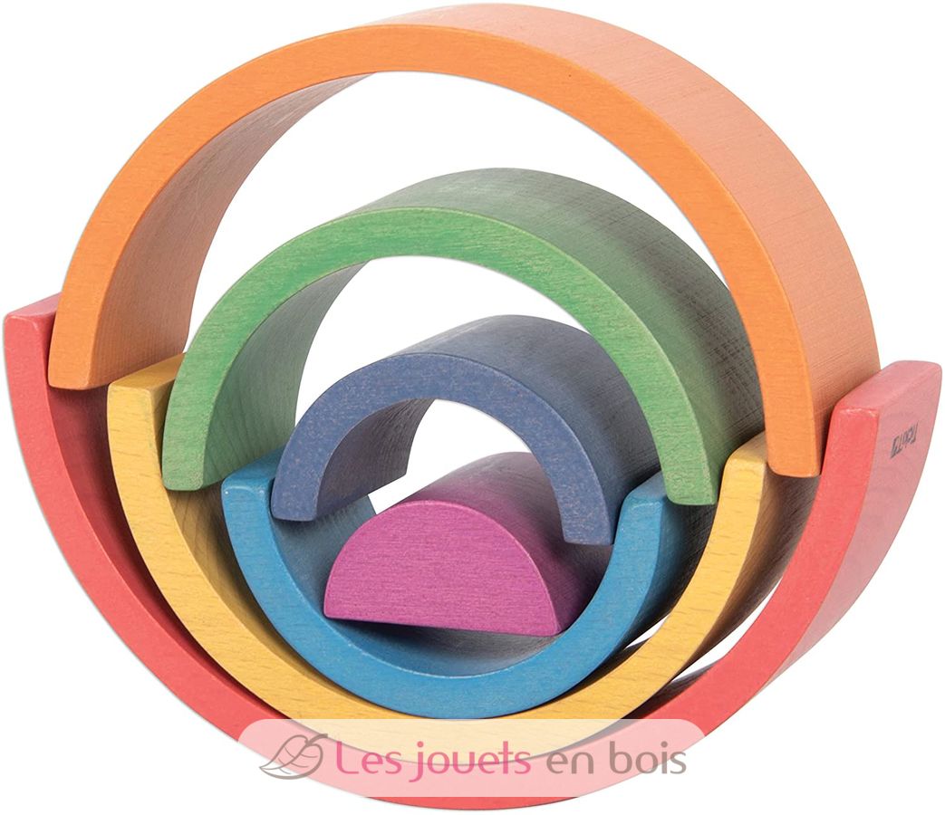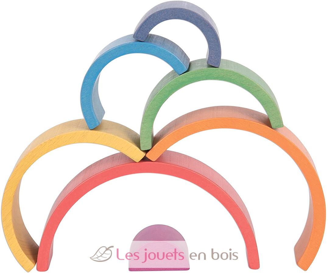 Dieses Set aus 7 Holzbögen in den Farben des Regenbogens ist ein Stapelspielzeug, das viele Spielmöglichkeiten bietet.