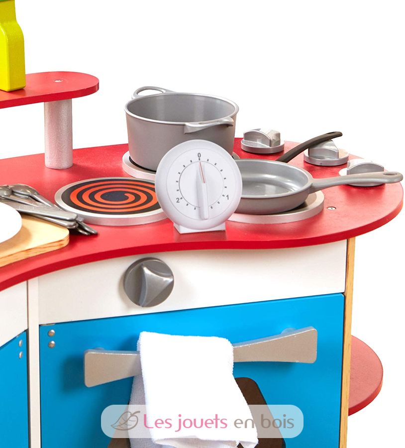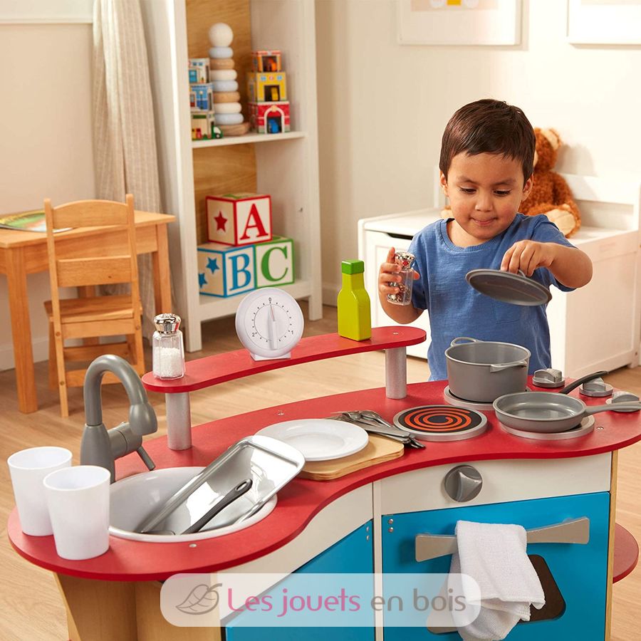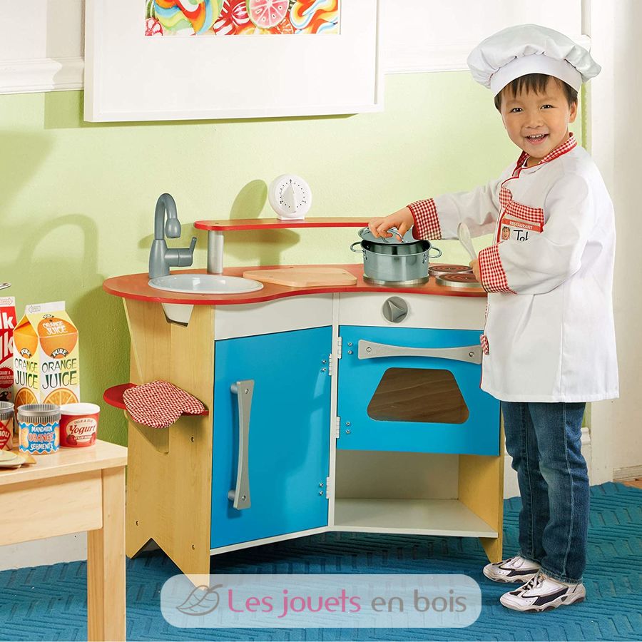 Ein herausnehmbares Waschbecken, ein Kochfeld mit drei Brennern, ein Ofen mit Klickknöpfen, ein Kühlschrank, Lagerregale, ein Schneidebrett und eine echte Funktionsuhr. In dieser kompakten und effizienten Holzküche ist alles enthalten, was ein junger Koch braucht!