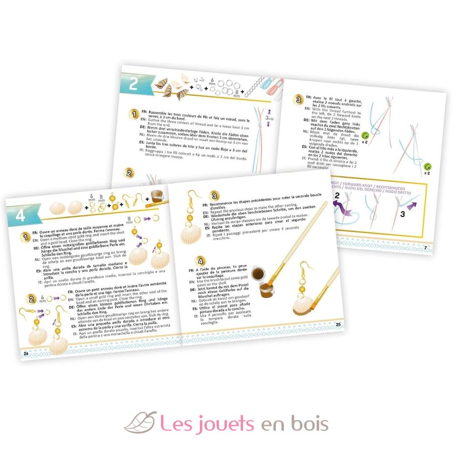 Mit diesem Bastelset kannst du 6 Schmuckstücke aus Muscheln gestalten! Verwebe die Fäden, füge Perlen und Goldfarbe hinzu und kreiere so 2 Halsketten, 3 Armbänder und ein Paar Ohrringe.