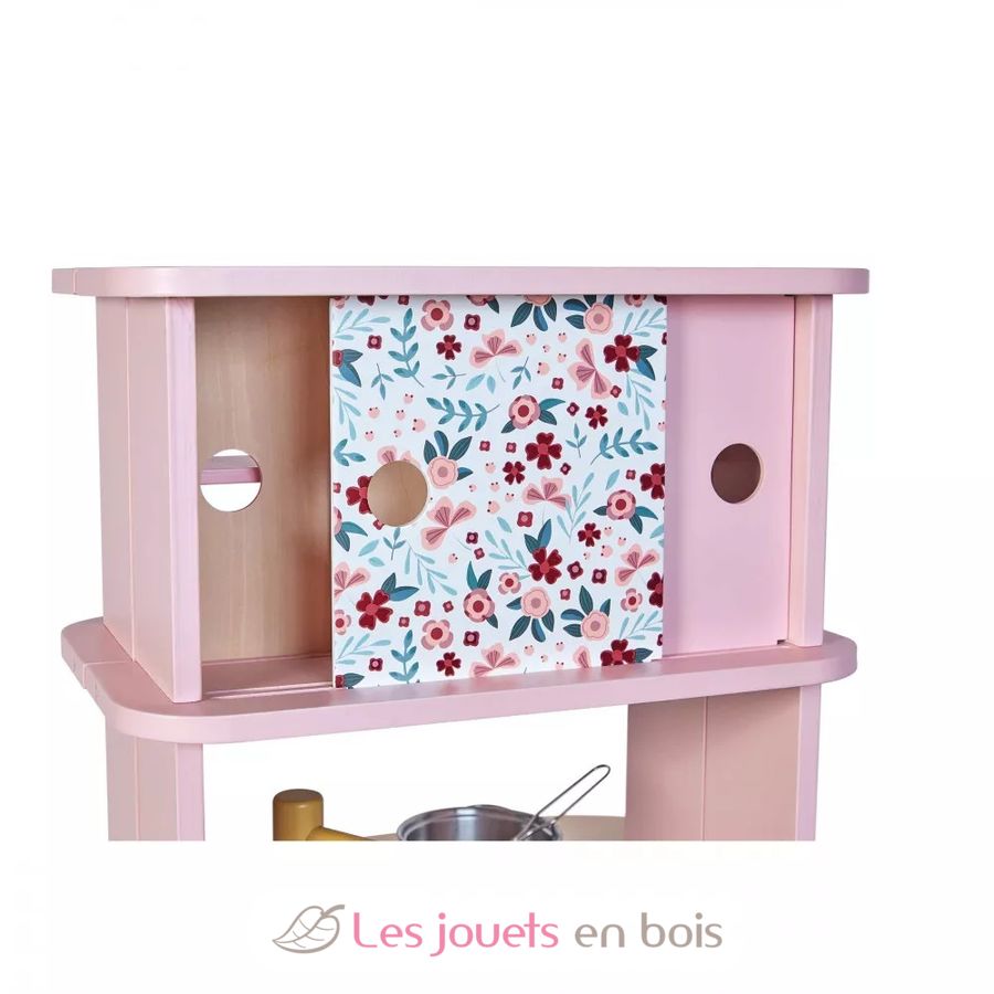 Sie ist perfekt ausgestattet mit der Spüle aus Metall, dem Wasserhahn aus Holz und der Induktionskochplatte mit Ton- und Lichteffekt. Einfach einmal die roten Tasten drücken, um die Kochplatten einzuschalten, und ein zweites Mal drücken, um das Geräusch von kochendem Wasser zu hören. Geräusche und Licht schalten sich nach 30 Sekunden automatisch aus oder wenn die Tasten ein drittes Mal gedrückt werden. Um den Backofen und die Waschmaschine in Gang zu setzen, sind diese mit je zwei Drehreglern mit Geräuschen ausgestattet. Die Türen sind magnetisch, und dank der durchsichtigen Scheibe können wir uns davon überzeugen, dass die Wäsche fertig gewaschen ist! Hinter 4 Schiebetüren können Kuchenformen und Süßigkeiten verstaut werden. In der Küche stehen zwei weitere Schränke zum Verstauen der Utensilien und anderer Gegenstände zur Verfügung. An zwei hübschen Haken aus Metall können Pfannenwender und Schaumlöffel aufgehängt werden! Diese hübsche Kinderküche mit Blumenmotiven wird mit 8 Zubehörteilen geliefert.