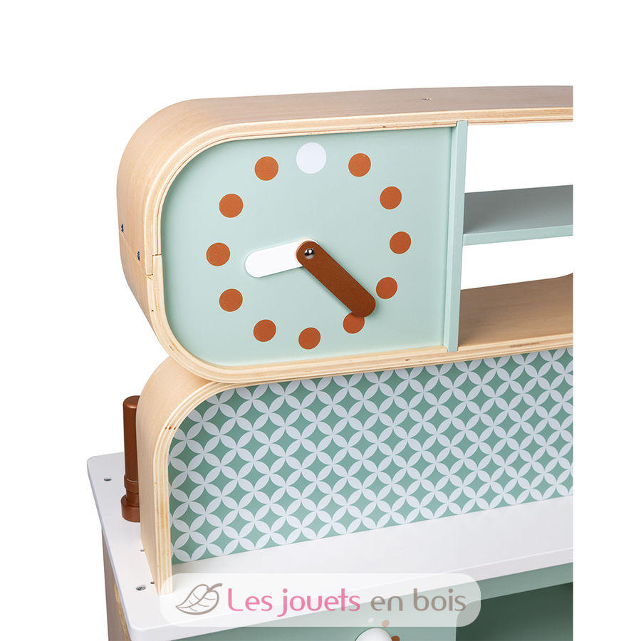 Vorne und hinten perfekt ausgestattet bietet sie eine Fülle von Spielmöglichkeiten – allein oder in der Gruppe. Eine Uhr mit funktionsfähigen Zeigern, eine Spüle aus Metall, eine Induktionskochplatte mit Licht und Geräuschen. Einmal auf die roten Tasten drücken, um die Platten einzuschalten, dann ein zweites Mal, um das Geräusch von kochendem Wasser zu hören. Geräusche und Licht schalten sich nach 30 Sekunden automatisch aus oder wenn man ein drittes Mal auf die Tasten drückt.