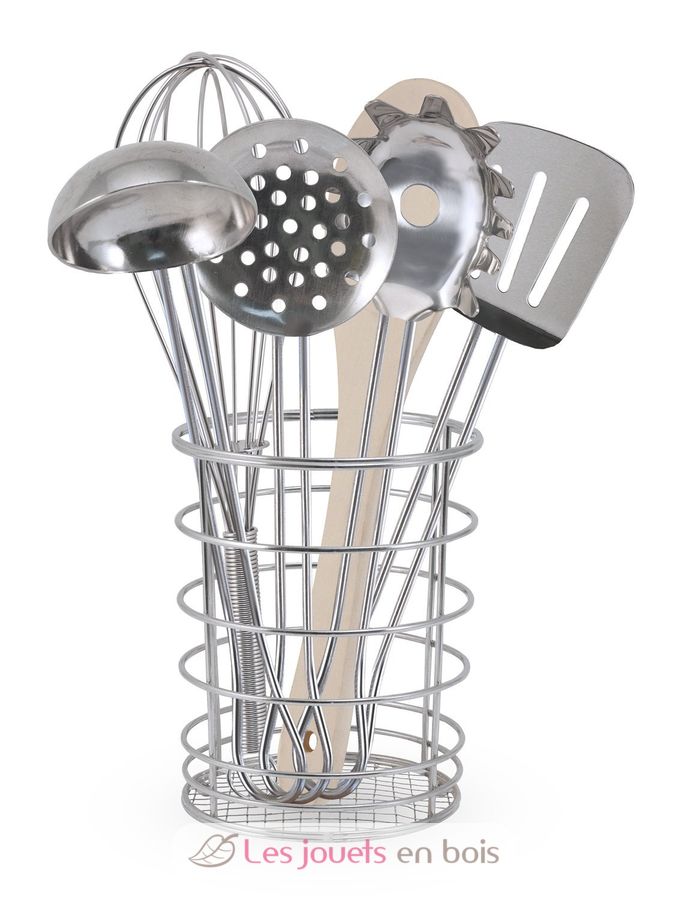 Dieses 7-teilige Set bringt einen professionellen Touch in Spielküchen! Sechs stabile Küchenutensilien aus Edelstahl und Holz sind großzügig dimensioniert und entsprechen so bestens den Ansprüchen der kleinen Köche. Alle Gegenstände — einschließlich von Schneebesen, Schöpfkelle, Abschöpflöffel, Spaghetti-Servierer und hölzernem Kochlöffel — passen in einen Metallhalter, der hilft, in der Spielküche Ordnung zu halten! Dieses Set ist stabil und langlebig in seinem Design und passt in seinem Format perfekt zu der Spielküchenzubehörserie aus der Melissa & Doug-Kollektion „Familie Spielen!“