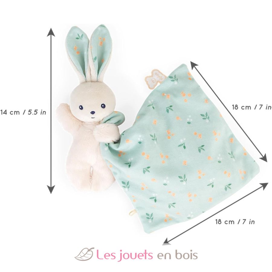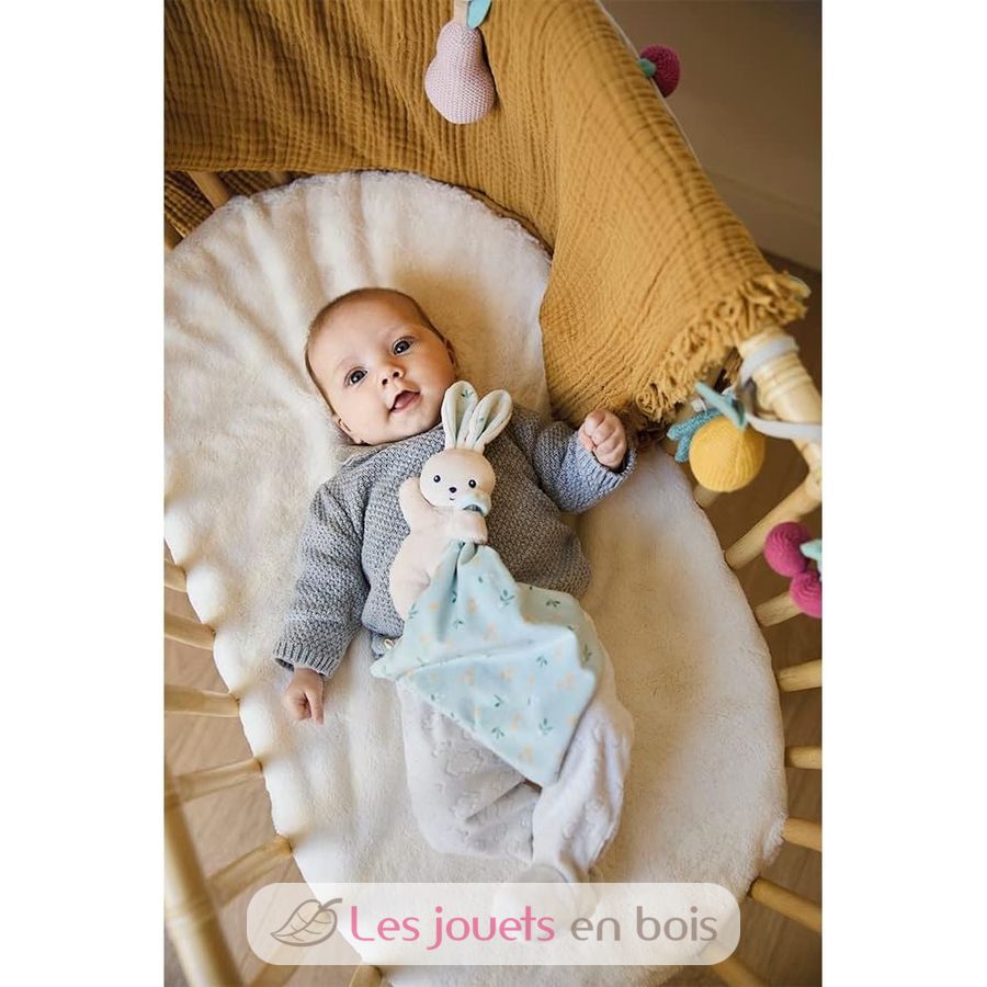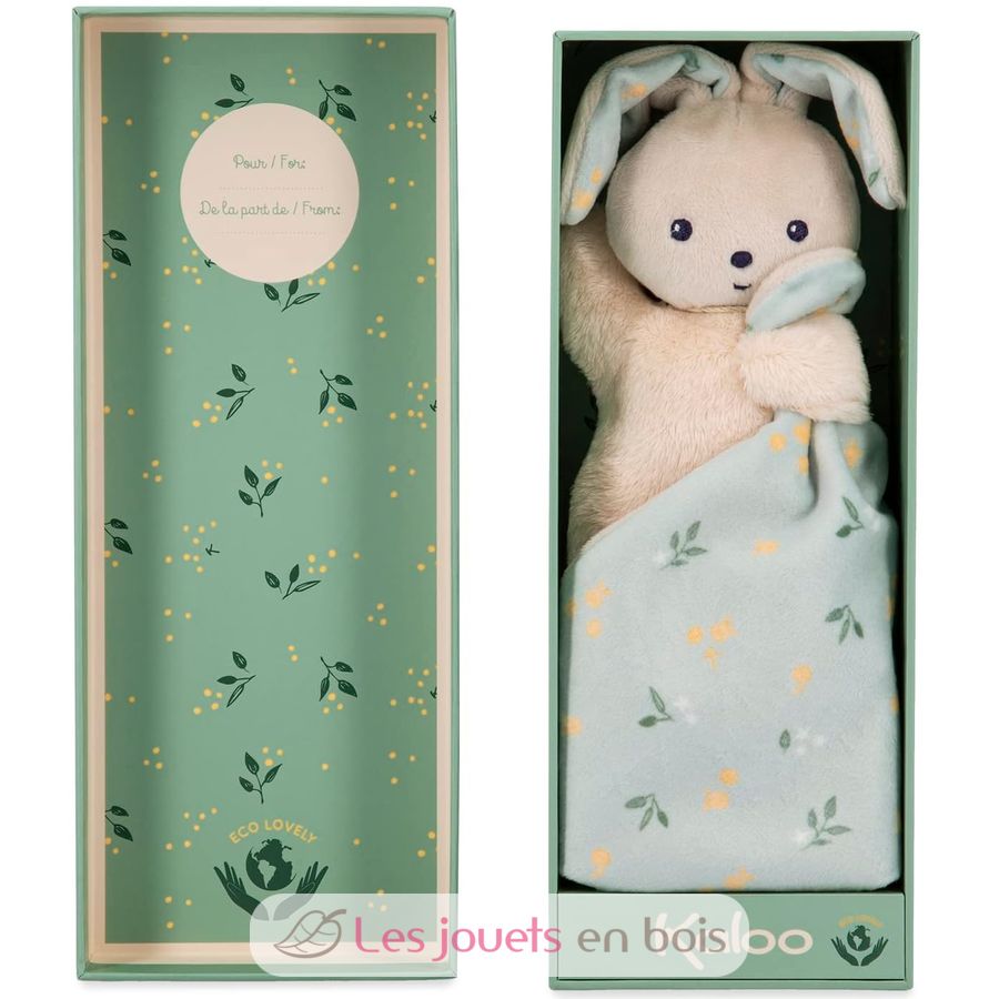 Dieser Hase mit seinem weichen Kuscheltuch wird Babys bester Freund sein. Material und Füllung bestehen aus recycelten Plastikflaschen, sodass dieses Doudou 100 % nachhaltig ist. Mit seinem kleinen, weichen Körper aus Mikrovelour lässt sich der Hase leicht greifen und am Körper oder den langen Ohren festhalten. Der kleine Hase hält in seinen Pfoten ein Kuscheltuch, das mitgoldenen Zitronen und anderen ländlichen Motiven verziert ist. Dieses zarte und poetische Druckmotiv ziert auch die Ohren des Hasen und rundet sein Erscheinungsbild ab. Er wird in einer hübschen Schachtel geliefert, die als Aufbewahrungsbox wiederverwendet werden kann. Dieses Doudou ist die perfekte Wahl für alle, die ein 100 % umweltfreundliches Geschenk suchen.