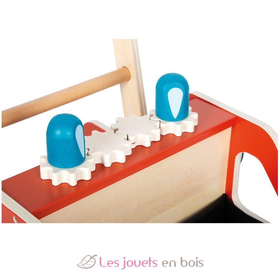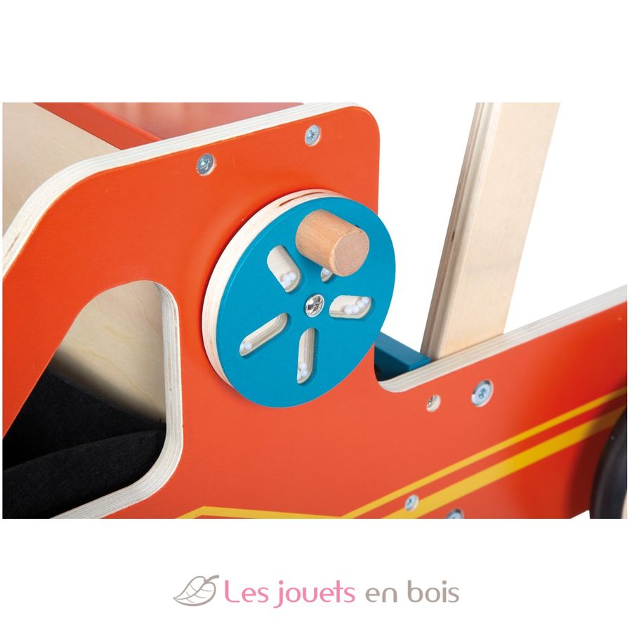 Das Highlight dieses Lauflernwagens ist das faszinierende Zahnrad-Spiel auf der Oberseite, das nicht nur die Sinne anregt, sondern auch die beiden Feuerwehr-Blaulichter zum Drehen bringt. Für zusätzlichen Spielspaß und Motoriktraining verfügt der Lauflernwagen über ein klapperndes Kurbelrad an der Seite.