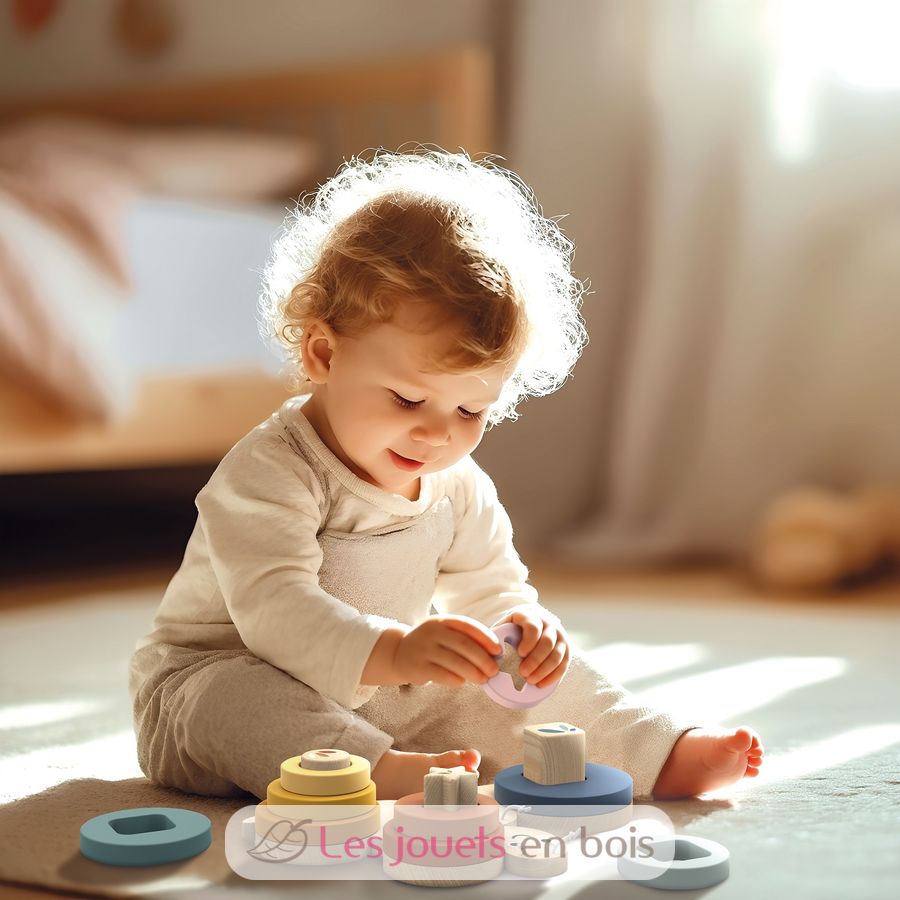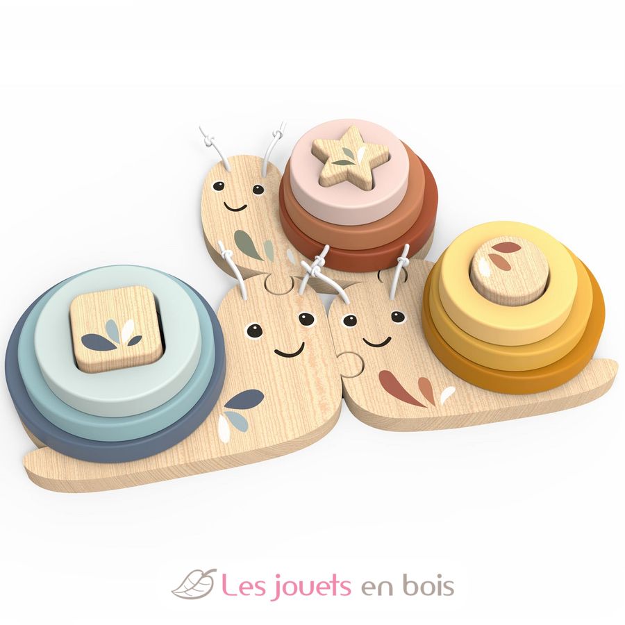 Das Lernspielzeug enthält neun bunte Stapelringe, die Kinder spiralförmig auf dem Schneckenhaus anordnen können. So werden Farberkennung, Zählen und Feinmotorik gefördert.