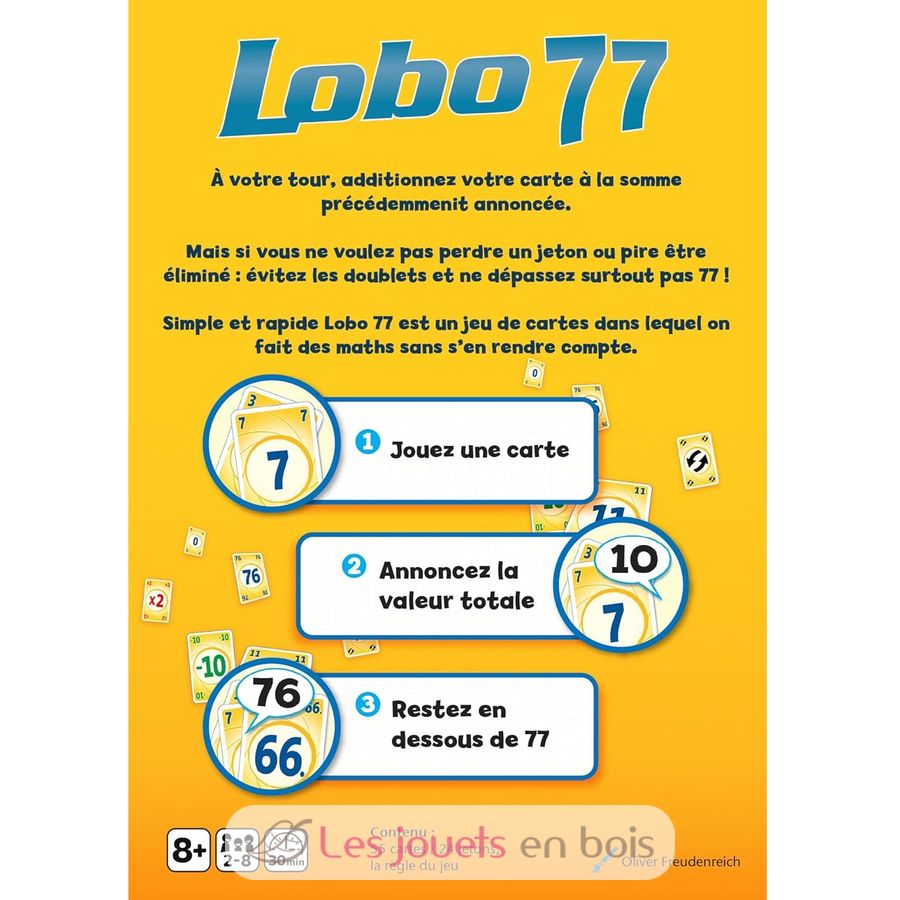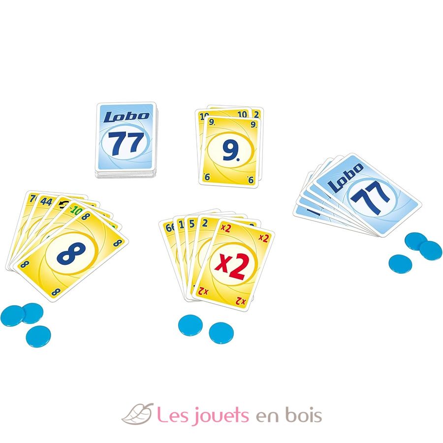 Jeder Spieler erhält 3 Spielsteine und anschließend 5 Karten mit einem bestimmten Wert. Jede Runde legt man eine Karte auf den Stapel, sagt die neue Summe der gestapelten Karten an und zieht anschließend eine Karte. Ist die Summe doppelt (11, 22, 33 usw.), verliert man einen Spielstein! Übersteigt sie 77, ist die Runde vorbei. Es gibt auch Spezialkarten, die dir helfen oder dich ruinieren können! Der letzte Spieler mit Spielsteinen am Ende des Spiels gewinnt. Lobo 77 ist ein kinderleichtes und spannendes Spiel!