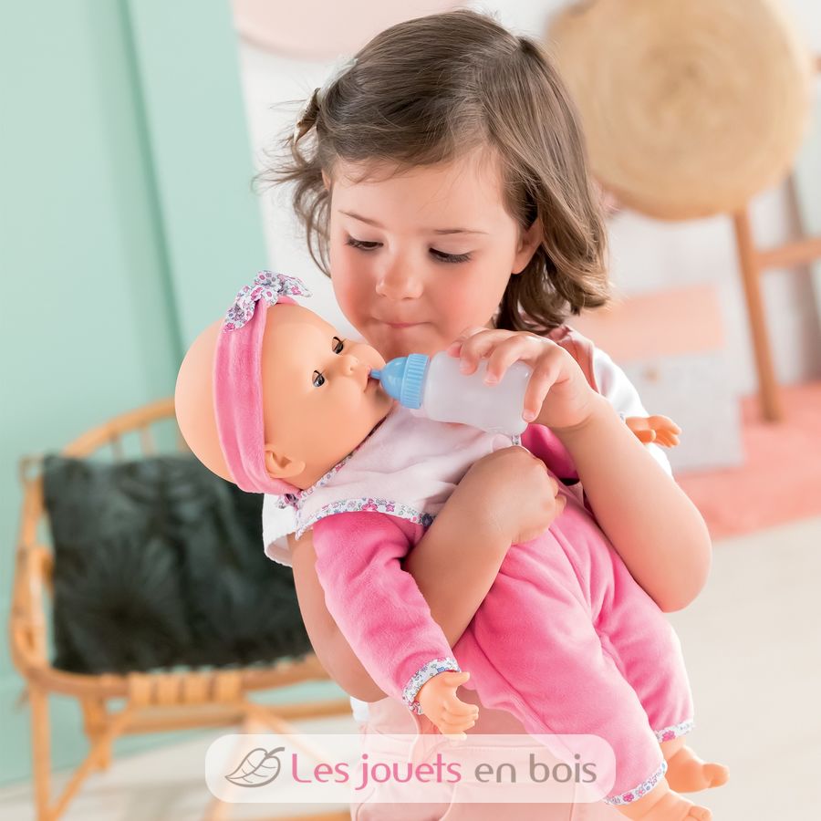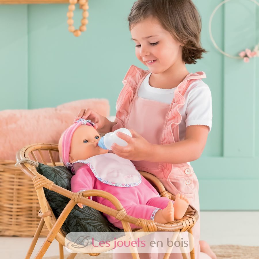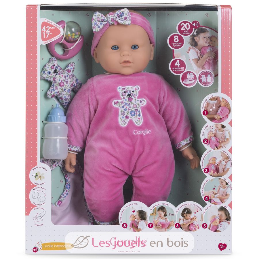 Lucille ist eine 42 cm große interaktive Puppe, die mit ihrer Flasche, ihrem Lätzchen, ihrem Schmusetuch und ihrer Rassel geliefert wird.