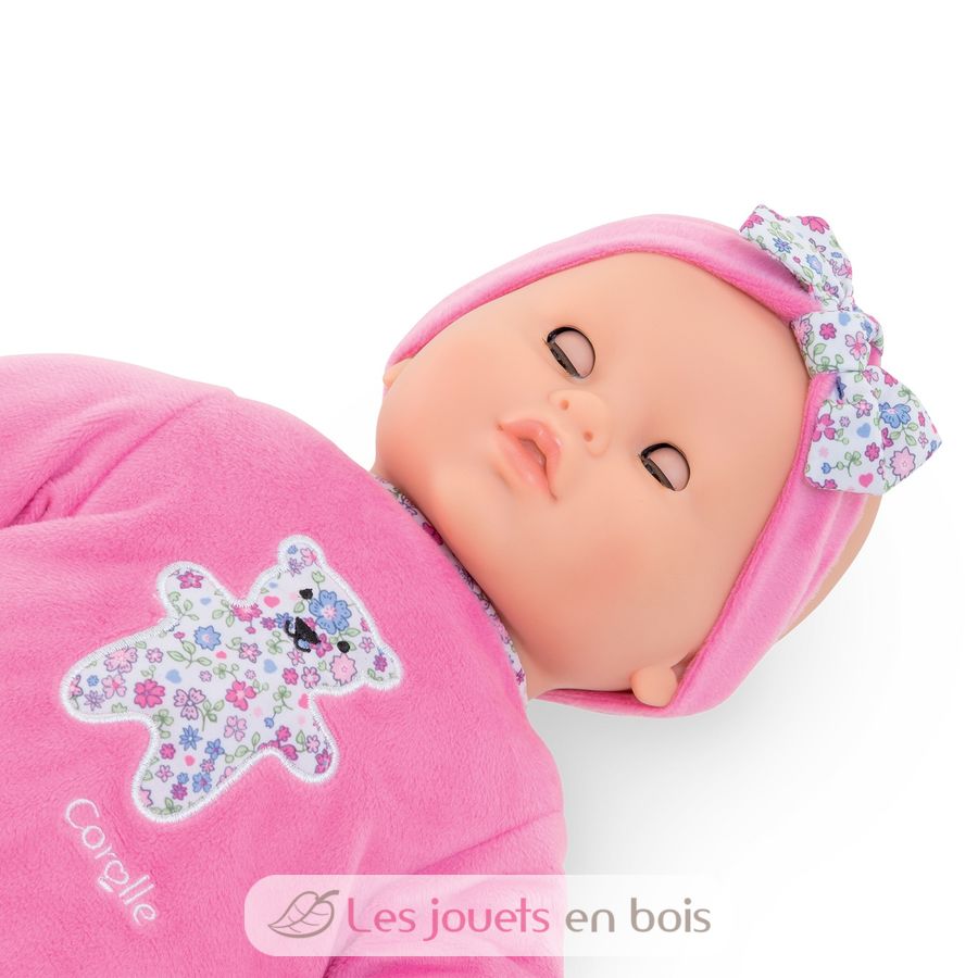 Sein flexibler Körper ermöglicht es ihm, dieselben Positionen wie ein echtes Baby einzunehmen. Ihr Gesicht, ihre Arme und Beine bestehen aus Soft-Touch-Vinyl mit dem zarten Vanilleduft, einem Markenzeichen der Corolle-Puppen. Mit seinen schläfrigen Augen schließt er die Augen zum Schlafen, wenn Sie ihn auf den Rücken legen.