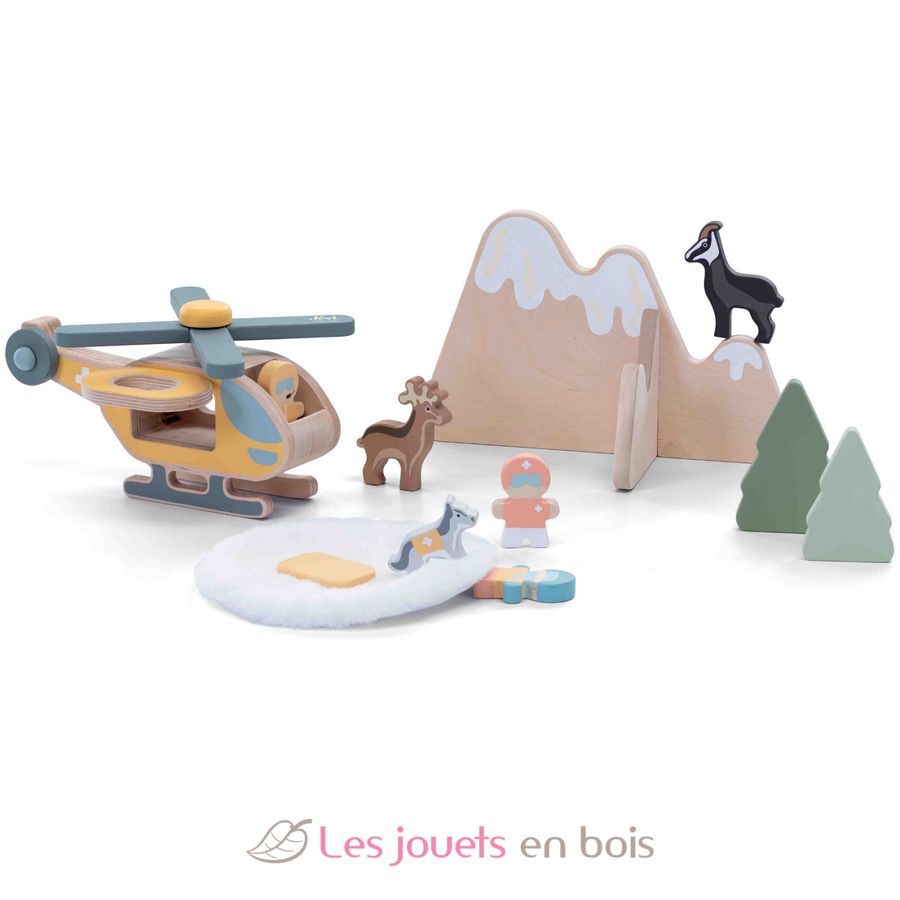 Es enthält einen alpinen Rettungshubschrauber vor einer Bergkulisse, einen Piloten, einen Retter, einen Rettungshund, eine verletzte Person, zwei Tiere und eine weiche Schneescheibe zur Simulation einer Lawine. Der Hubschrauber kann die verletzte Person auf einer Trage transportieren und sorgt so für ein umfassendes Spielerlebnis.