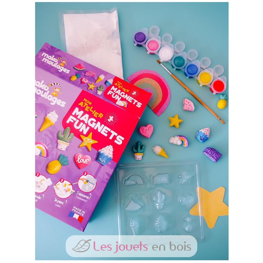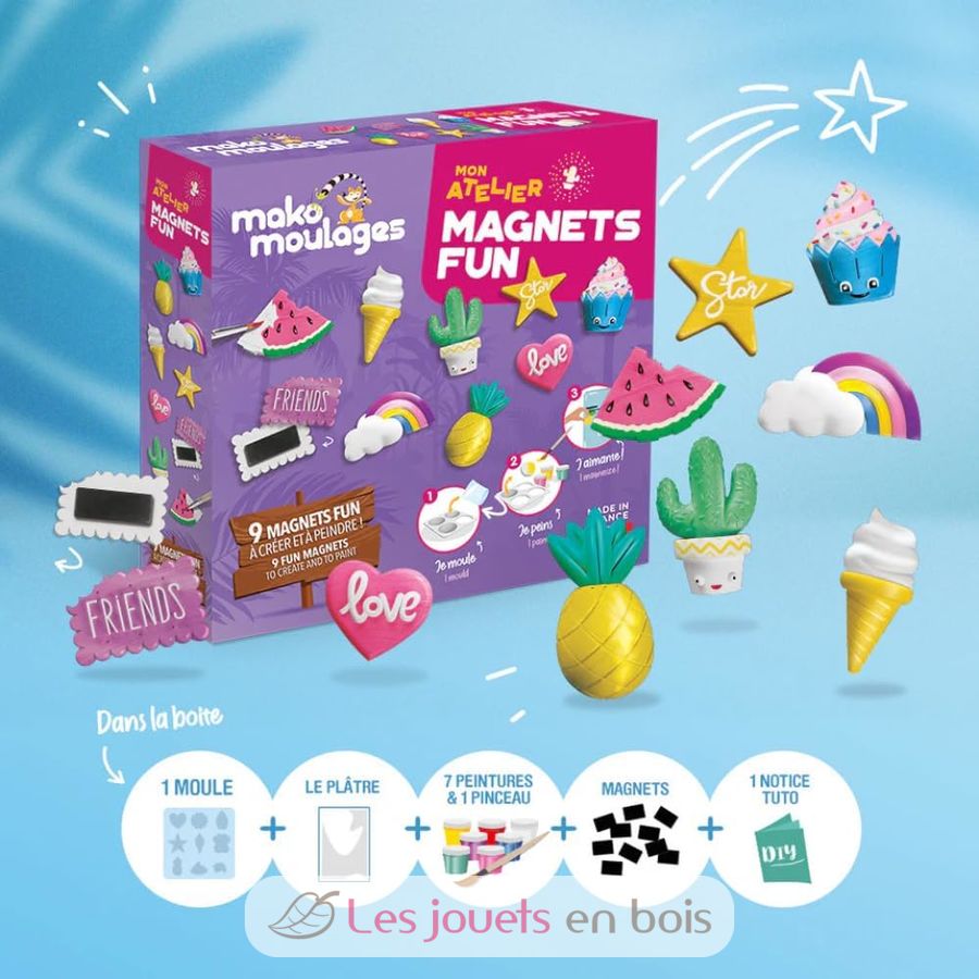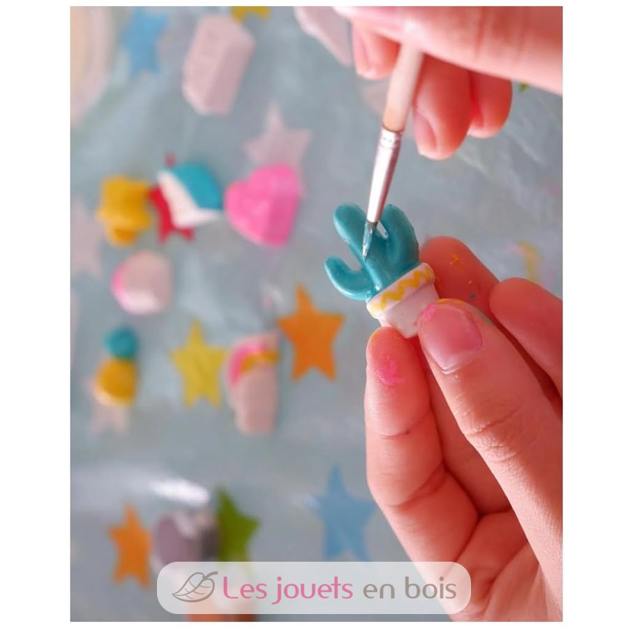 Ein kreatives Set in dem 9 Magnete in niedlichen Formen (Ananas, Herz, Eiscreme, Cupcake, Kaktus, Stern, Keks, Regenbogen, Wassermelone) geformt, entformt und bemalt werden. Anschließend können Sie sie mit den mitgelieferten Haftmagneten am Kühlschrank magnetisieren oder in Ihrem Zimmer aufhängen. Eine kreative Box für Spaß alleine oder mit anderen!