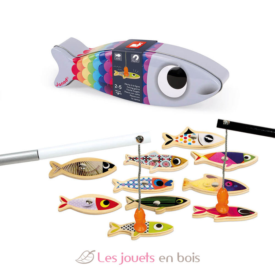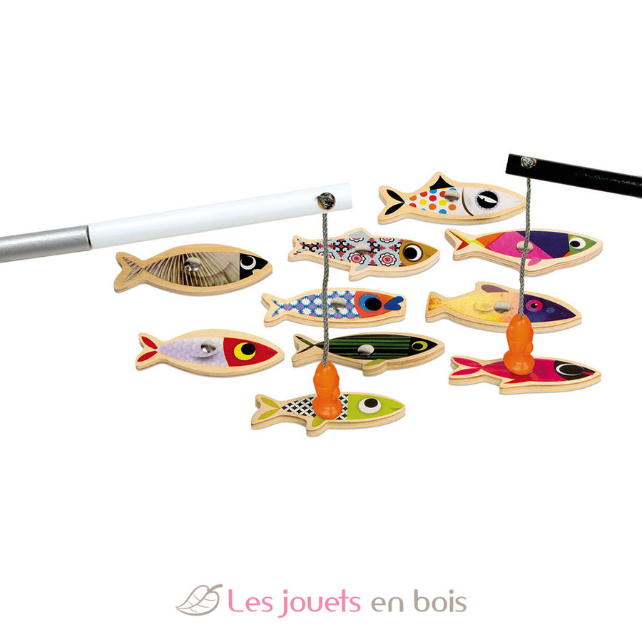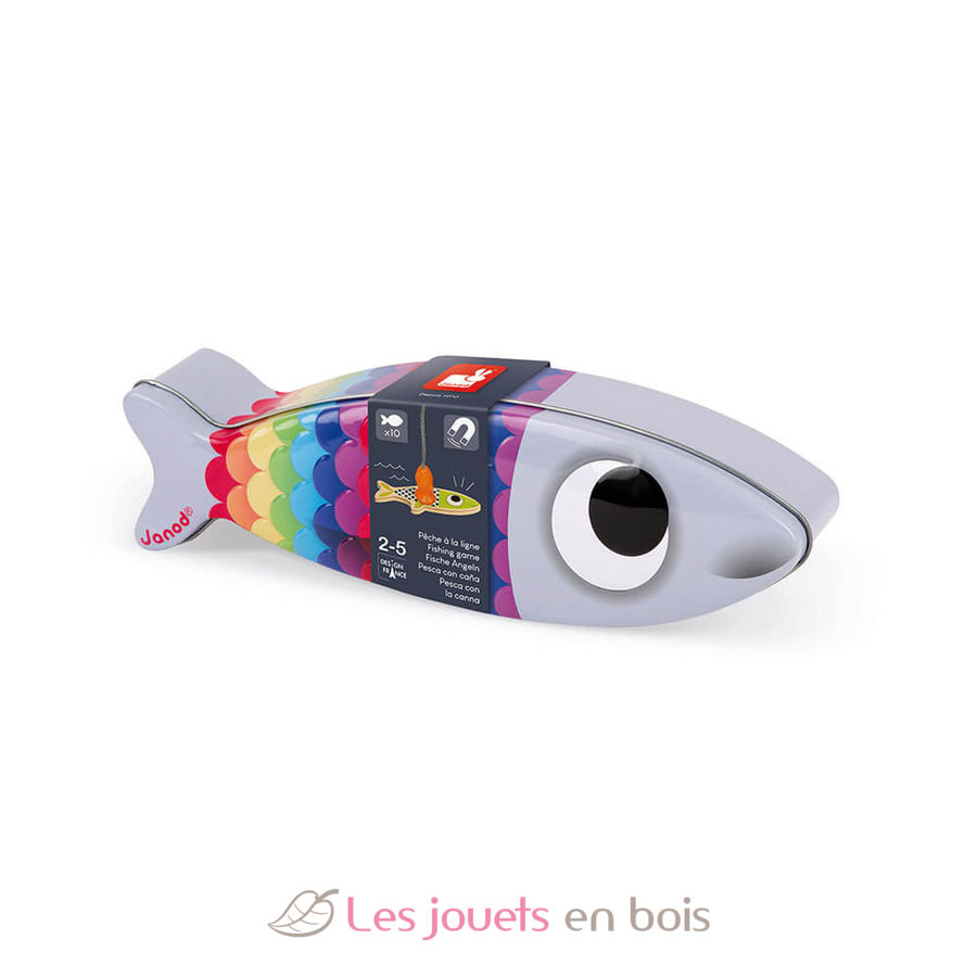 Magnetisches Angelspiel mit Fischen aus Holz. Verpackt in einer geprägten Geschenkdose aus Metall. Sammle mit deiner Angelrute die meisten Fische! 10 Fische - einer so schön wie der andere. Auf geht's zur Angelpartie! Inklusive 2 Angelruten. Angel-Spiel mit 10 lustigen und bunten Sardinen und 2 Angelruten aus Holz mit Plastikhaken in Form eines Fisches. Die Holzfische sind auf einer Seite per Thermotransfer-Verfahren bedruckt und auf beiden Seiten mit Nietnägeln versehen. Dieses Spiel ist selbst für Kinder unter 3 Jahre vollkommen sicher, da sich die Nietnägel nicht lösen können. Das Spiel wird in einer prächtigen, beidseitig bedruckten Metalldose in Form einer Sardine mit hervorgehobenen Stellen (Augen, Schuppen) verkauft.