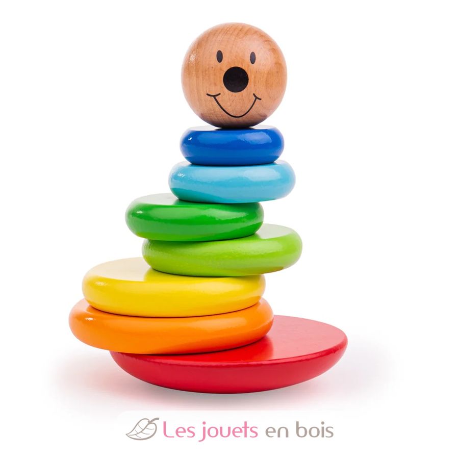Dieser fröhlich-bunte Wackelturm wird aufgebaut, indem die Ringe aufeinander gelegt werden. Die Magnete im Inneren halten ihn zusammen.