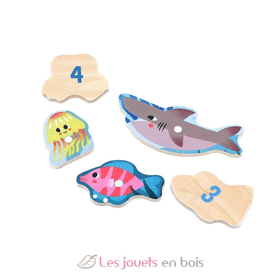 Ausgestattet mit seiner hölzernen Angelrute muss sich Ihr Kind einer echten Herausforderung stellen: alle Meerestiere zu fangen. Während seines Tauchgangs begegnet er einem Rochen, einem Wal, einer Krabbe, einer Qualle … Insgesamt 12 unglaublichen und farbenfrohen Tieren.