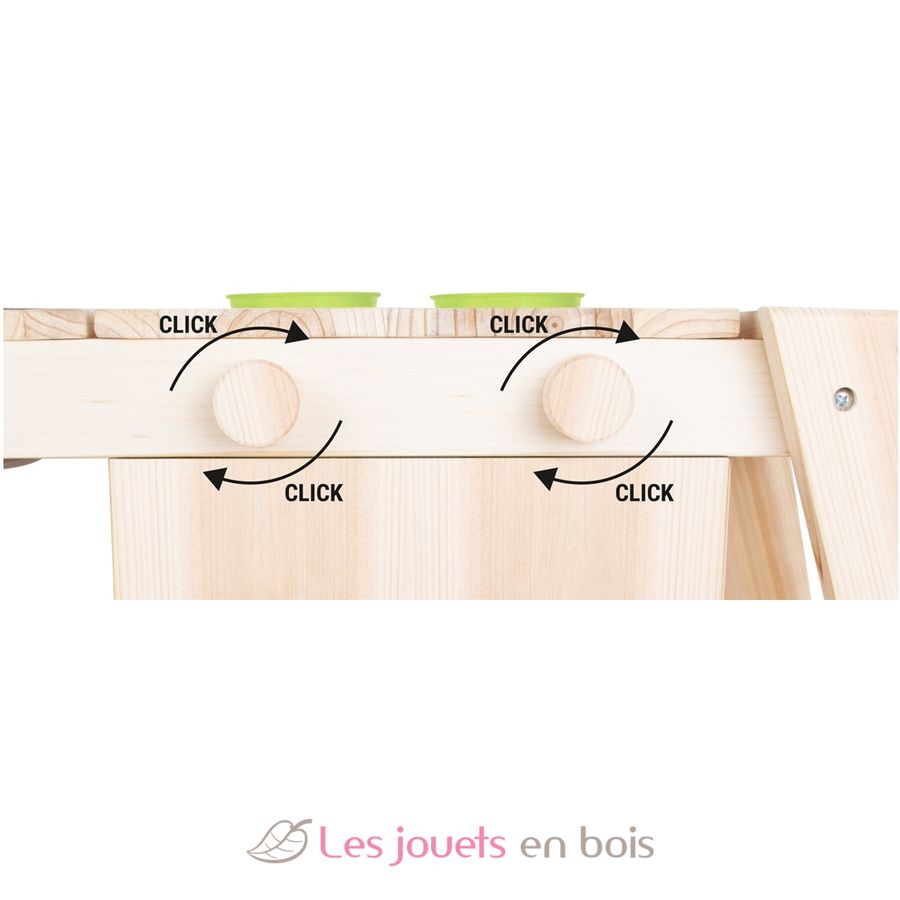 Dank unkaputtbarer Räder lässt sie sich nach Herzenslust verschieben! Ein Backofen, dessen zwei Drehknöpfe ein Klickgeräusch machen, eine große Matschschüssel, zwei Matschtöpfchen und zwei Pflanztöpfe aus Metall sowie Aussparungen, Langlöcher, Haken und Staufläche für die Ordnung von Gartengeräten, Kochequipment und Matschutensilien machen die außergewöhnliche Sommerküche komplett!