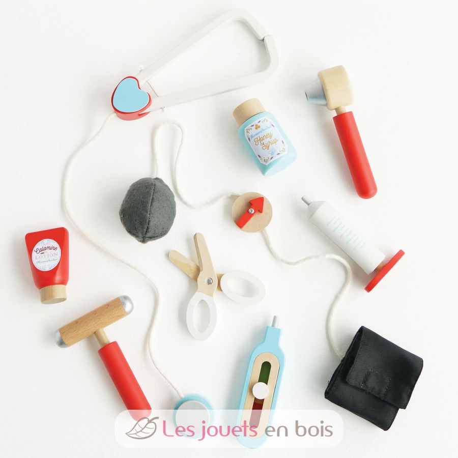Doktor! Arzt! Ein Vintage-Stil, Kind Größe Stoffbeutel mit verschiedenen medizinischen Instrumenten und Holzflaschen abgefüllt. Das Set besteht aus Stethoskop, Thermometer, Spritze, Blutdruckmessgerät, Otoskop Ohr, Reflexhammer, Schere und zwei Fläschchen von Medikamenten. Für Kinder ab 3 Jahren. Ein Spielzeug in der Le Toy Van ref: TV292