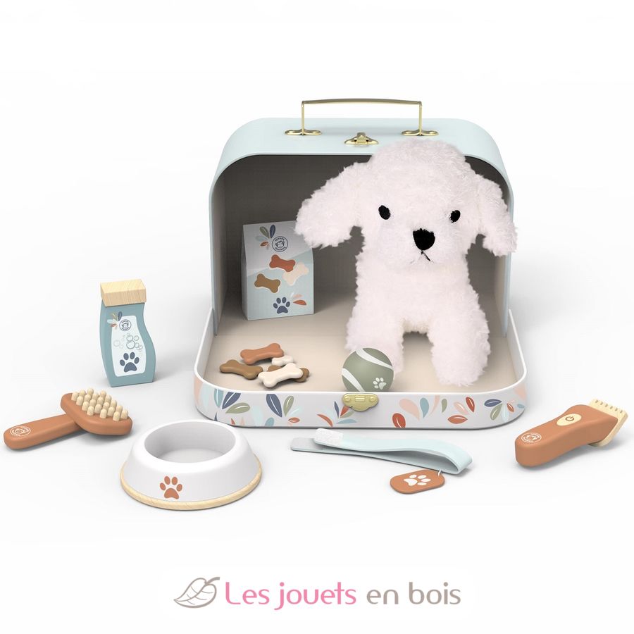 In diesem wunderschön gestalteten Koffer finden Kinder alles, was sie für die Pflege ihres Lieblings-Hundekuscheltiers (im Lieferumfang enthalten) benötigen.