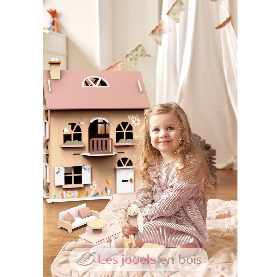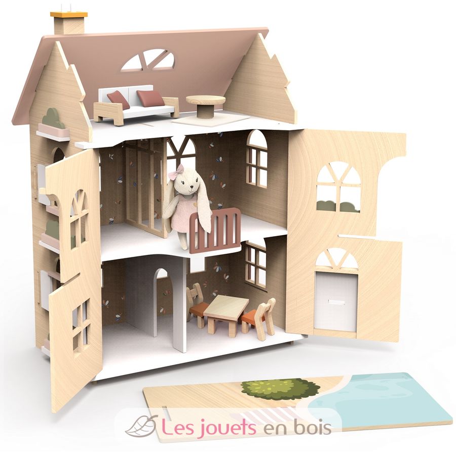 Genießen Sie die Schönheit dieses Puppenhauses aus sorgfältig gestaltetem, FSC-zertifiziertem Holz, das Charme und Eleganz ausstrahlt.