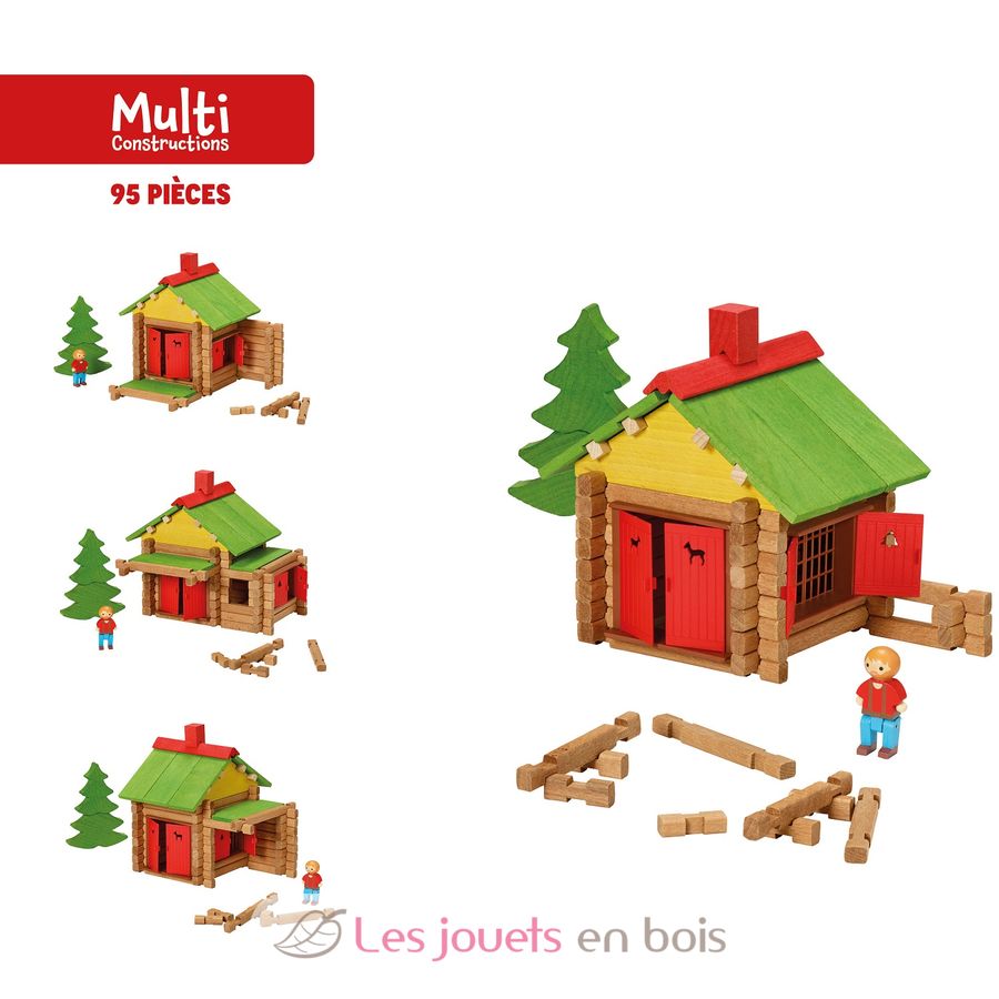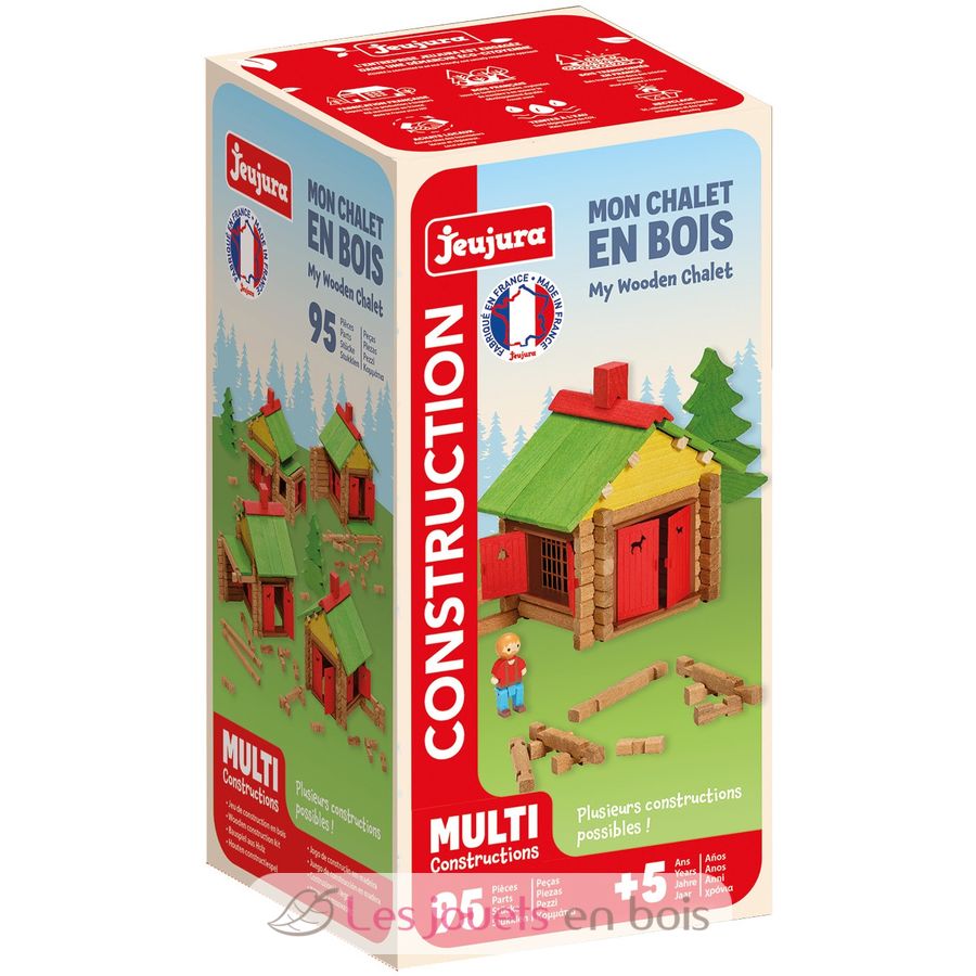 Ein Bauspiel aus natürlichem und gebeiztem Holz mit 95 Teilen und einer Bauanleitung, um zu lernen, wie man ein authentisches Holzchalet baut.