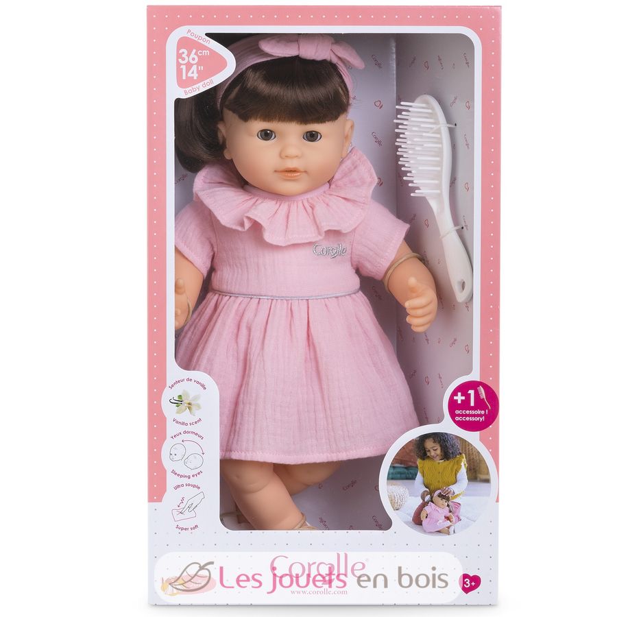Sein flexibler Körper ermöglicht es ihm, dieselben Positionen wie ein echtes Baby einzunehmen und aufrecht zu sitzen. Ihr Gesicht, ihre Arme und Beine bestehen aus Soft-Touch-Vinyl mit dem zarten Vanilleduft, einem Markenzeichen der Corolle-Puppen. Mit seinen schläfrigen Augen schließt er die Augen zum Schlafen, wenn Sie ihn auf den Rücken legen.