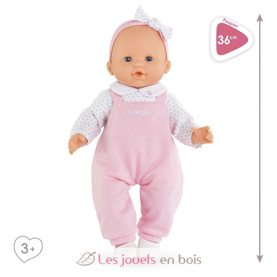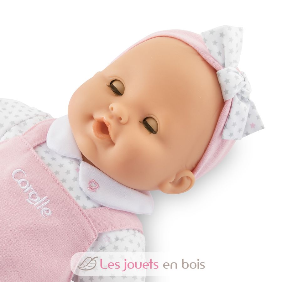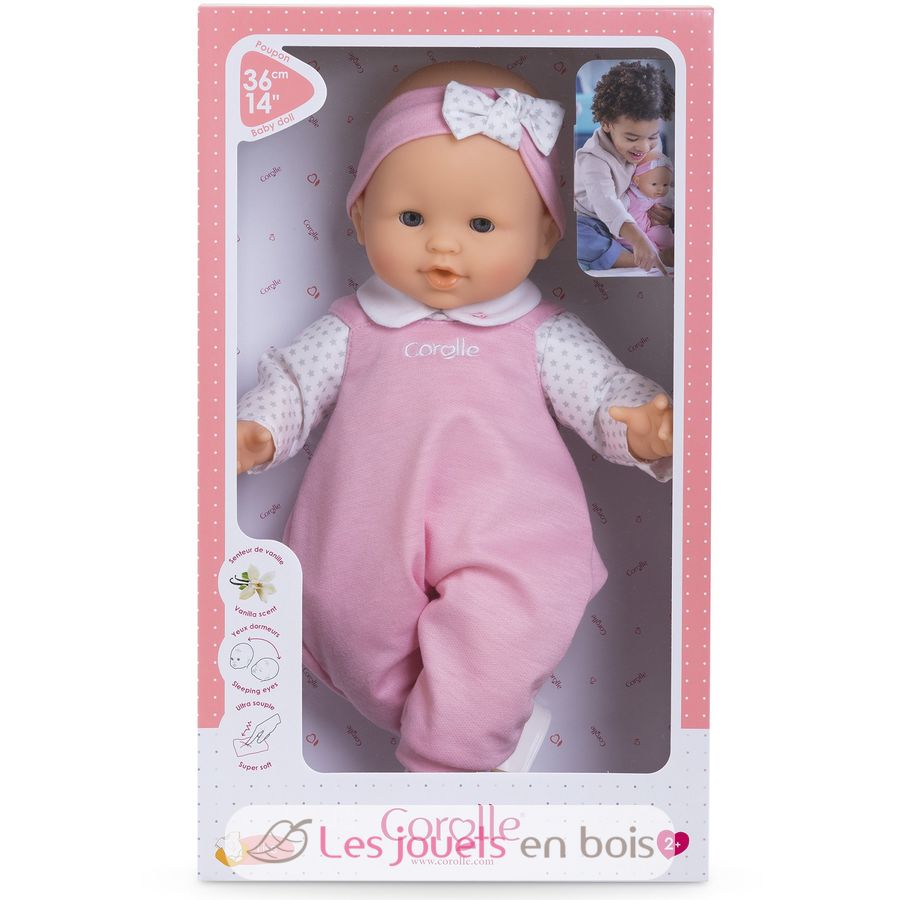 Lise ist eine 36 cm große Puppe. Sein flexibler Körper ermöglicht es ihm, dieselben Positionen wie ein echtes Baby einzunehmen und aufrecht zu sitzen. Ihr Gesicht, ihre Arme und Beine bestehen aus Soft-Touch-Vinyl mit dem zarten Vanilleduft, einem Markenzeichen der Corolle-Puppen. Mit seinen schläfrigen Augen schließt er die Augen zum Schlafen, wenn Sie ihn auf den Rücken legen. Diese Puppe kann einen Schnuller nehmen oder am Daumen lutschen.
