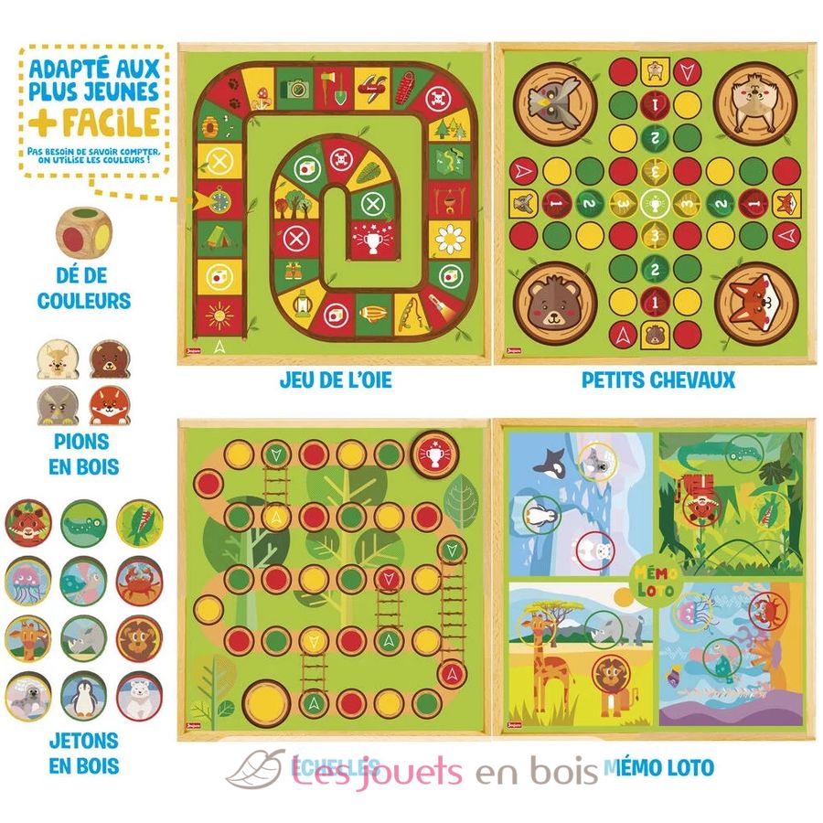 Eine Schachtel mit traditionellen Spielen, überarbeitet und angepasst für die Kleinen, mit einem Ludo-Spiel, einem Gänsespiel, einem Leiterspiel und einem Memo-Lotto.