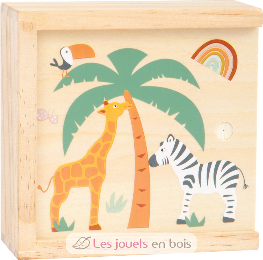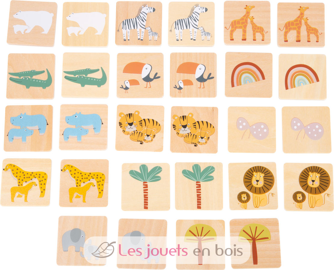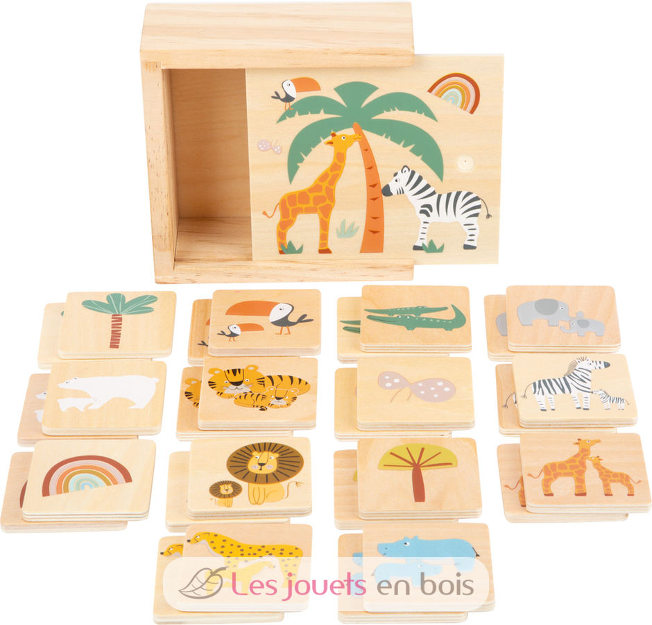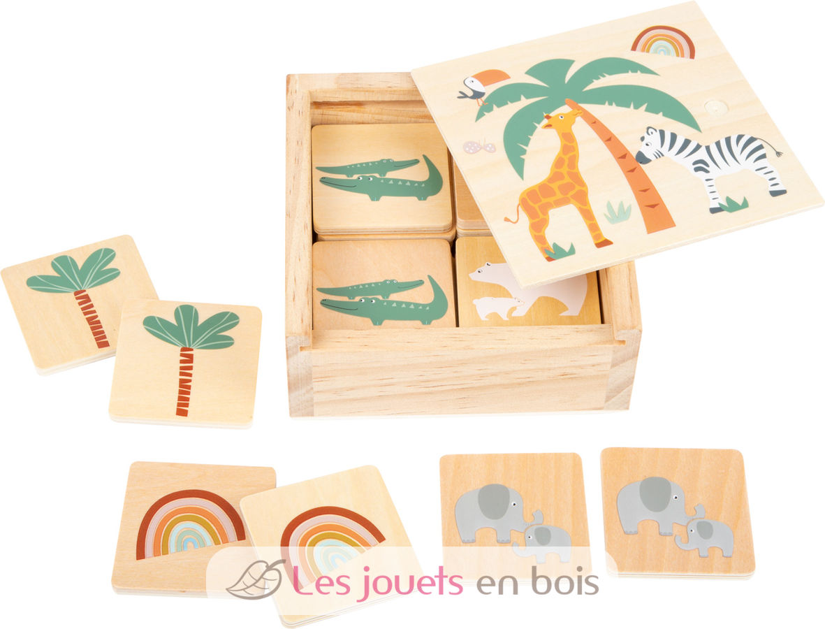 Die kindgerecht gestalteten Holztäfelchen zeigen niedliche Safari-Motive in Trendfarben, sodass Kinder Schritt für Schritt in die abenteuerliche Welt wilder Tiere eintauchen. Die Kleinen trainieren beim Spielen so nicht nur spielerisch ihr Gedächtnis, sondern lernen auch die Bewohner der Savanne kennen.