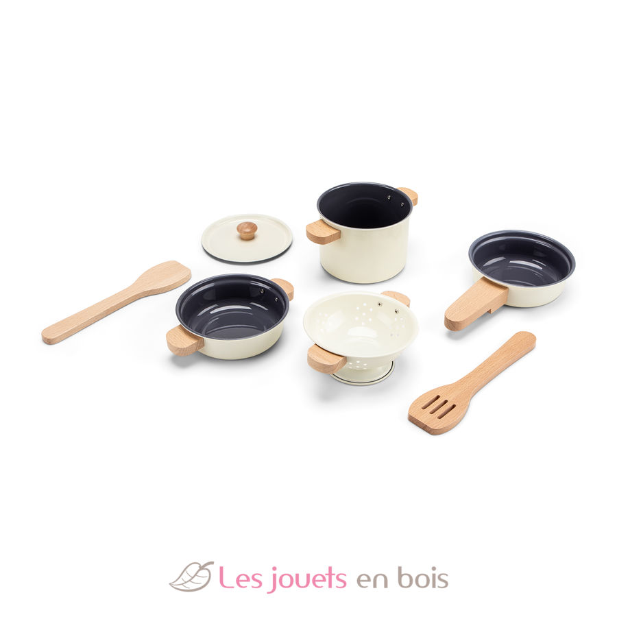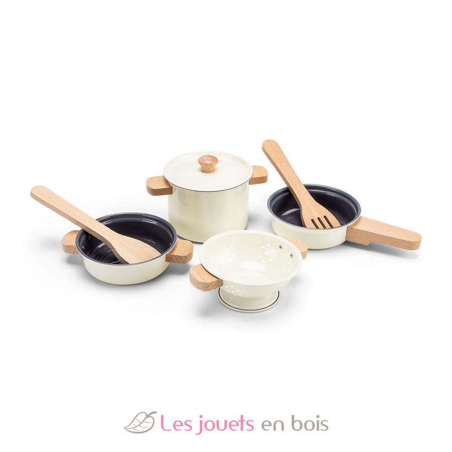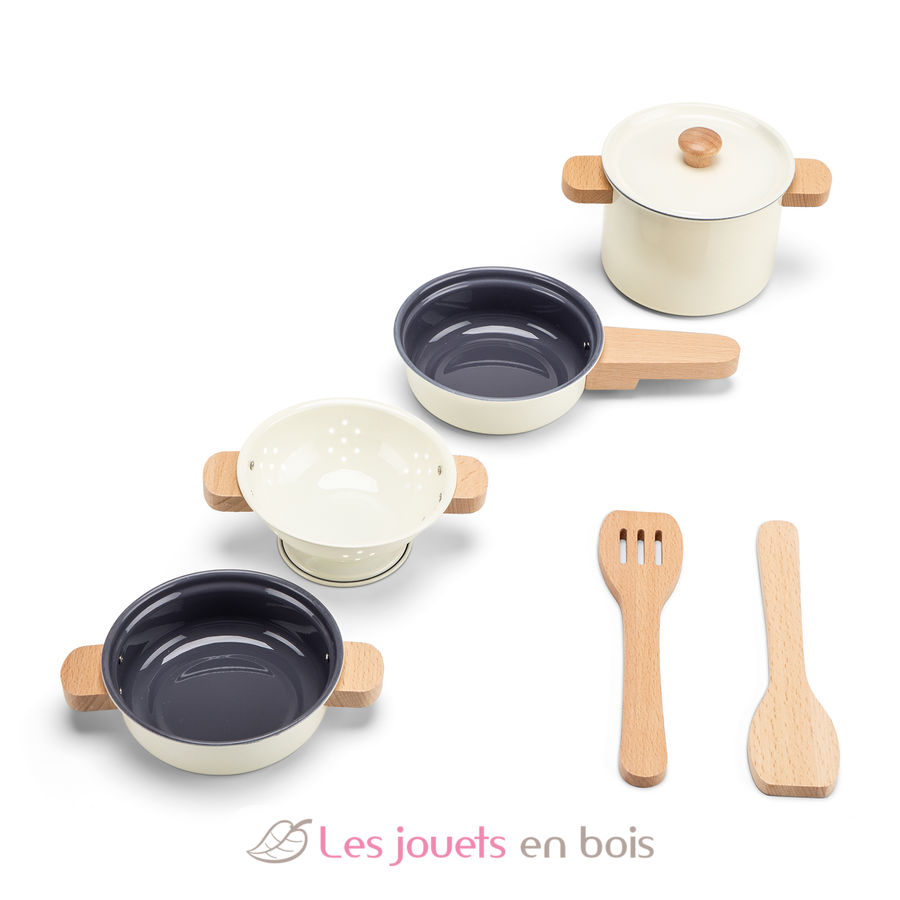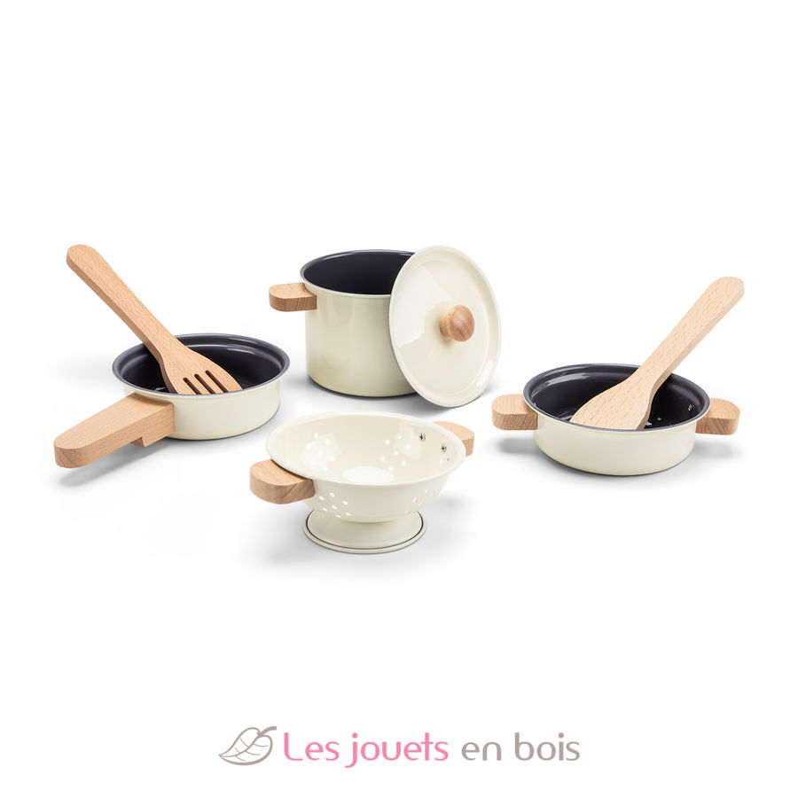 Dieses Topfset aus Metall ist die perfekte Ergänzung für jede Kinderküche. Dieses 7-teilige Spielset besteht aus zwei Kochtöpfen, einer mit Deckel, einer Bratpfanne und einem Sieb. Das Set enthält außerdem zwei Holzspatel, damit die Kleinen ihre Gerichte während des Kochens umrühren können.