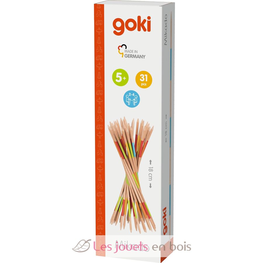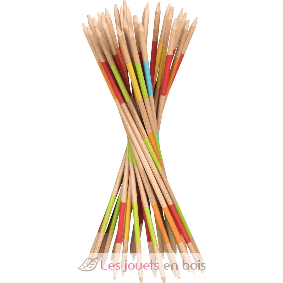 Die bunten Mikado-Holzstäbe erfordern Ruhe, Geschicklichkeit und Konzentration. Jeder Spieler versucht möglichst viele Mikado-Stäbe aufzunehmen, ohne andere Stäbe zu bewegen. Wer am Ende die meisten Punkte erzielt hat, gewinnt das Spiel.