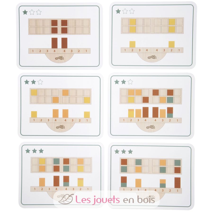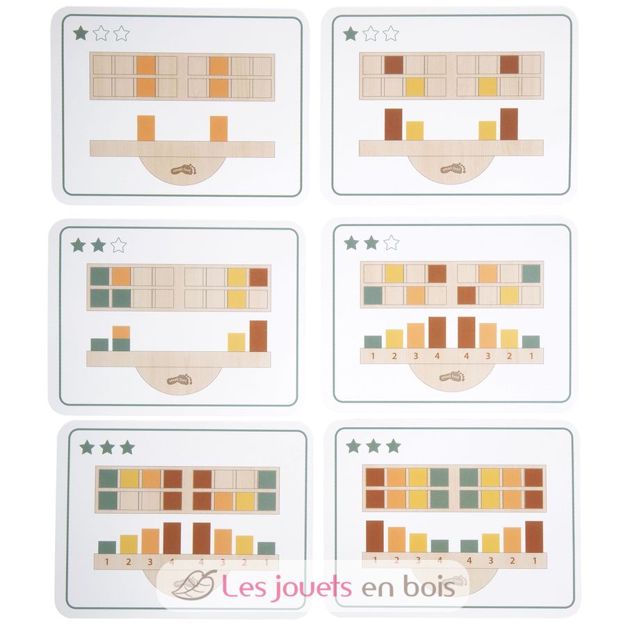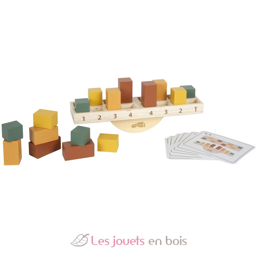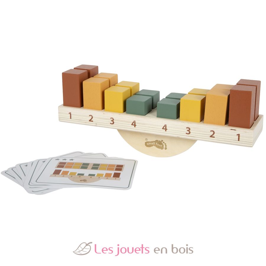 Die Basis bildet eine stabile Wippe, in deren Vertiefungen unterschiedlich hohe und schwere Holzblöcke geschickt eingesetzt werden müssen, um das Gleichgewicht zu halten. Bestandteil des Spielsets sind 16 farbige Holzblöcke und inspirierende Beispielkarten, die als Anleitung dienen und durch unterschiedliche Schwierigkeitsgrade Abwechslung ins Spiel bringen. So können Kinder je nach Alter und Fähigkeit frei stapeln oder gezielt nach Vorlage spielen.