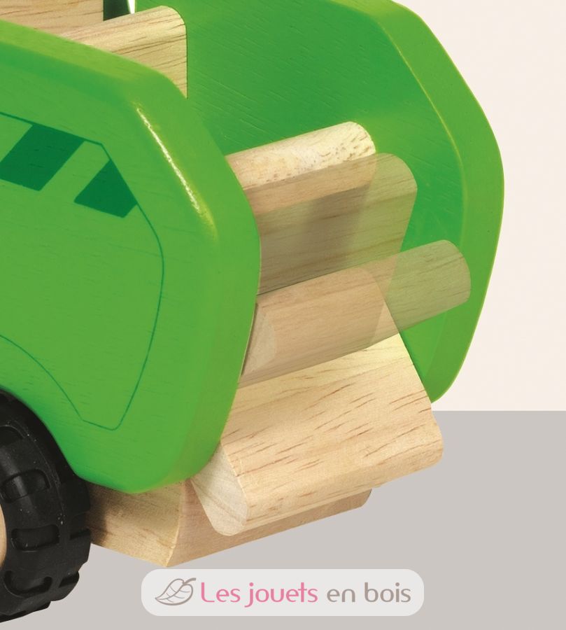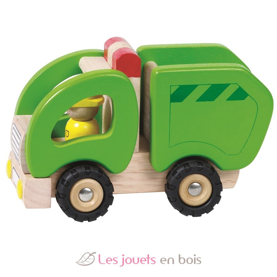Müllwagen grün, Holzfahrzeuge der Marke Goki.