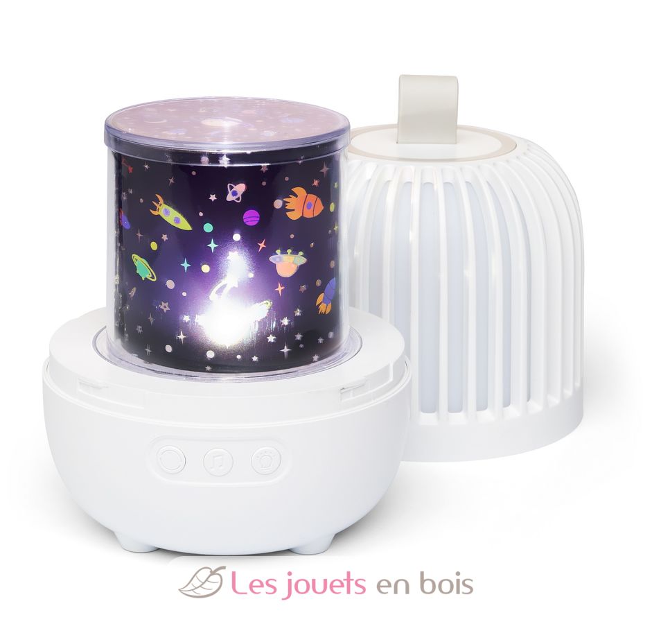 Es ist ein wiederaufladbares Musikprojektor-Nachtlicht mit 3 austauschbaren Projektionsmustern (Weltraum, Ozean, Blumen) und 8 verschiedenen Melodien.