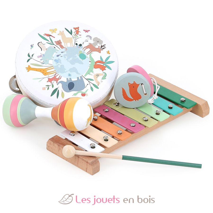 Ein schönes Musikset, das von Sarah Betz illustriert wurde und aus 4 Musikspielzeugen besteht: einem Tamburin, einem Metallophon, ein Maracas und Kastagnetten.