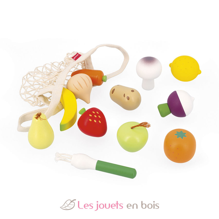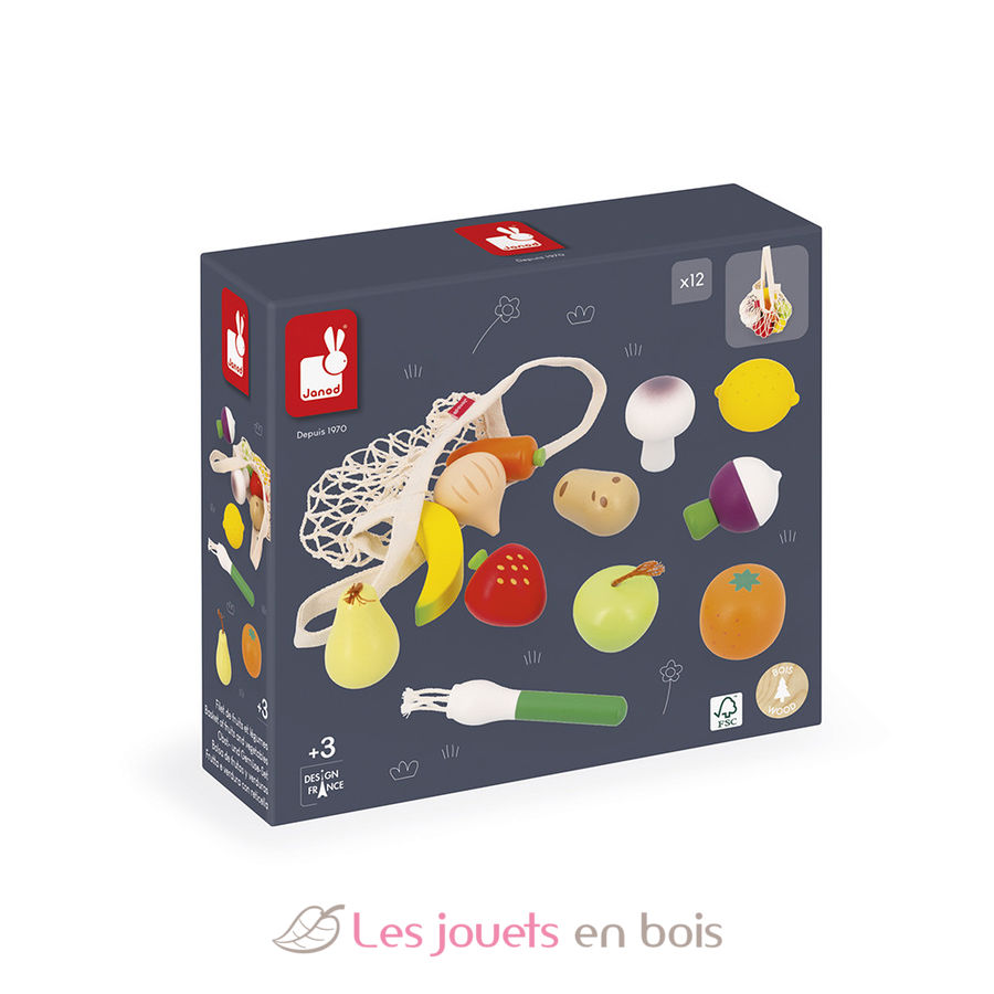 Dieses hübsche Set besteht aus 12 Obst- und Gemüsestücken aus Holz, sowie einem Netz zum Transportieren. Es ergänzt wunderbar die Küche, die Dinette oder auch den Kaufmannsladen der Kleinen! Mit diesem Nachahmungsset können Kinder wie die Großen kochen und ihre Bewegungen nachahmen, um spielerisch zu lernen.